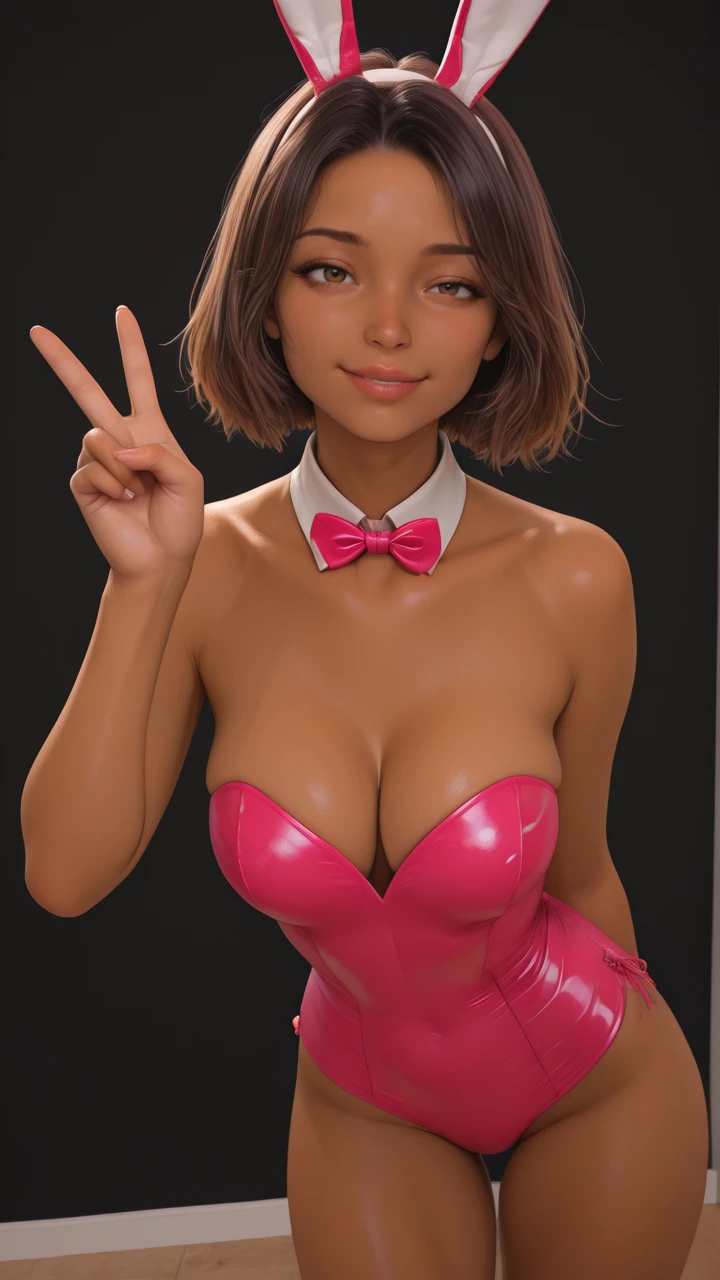 bunny ears headband, white collar with pink bow tie, pink bunny suit, strapless, cleavage, bare legs