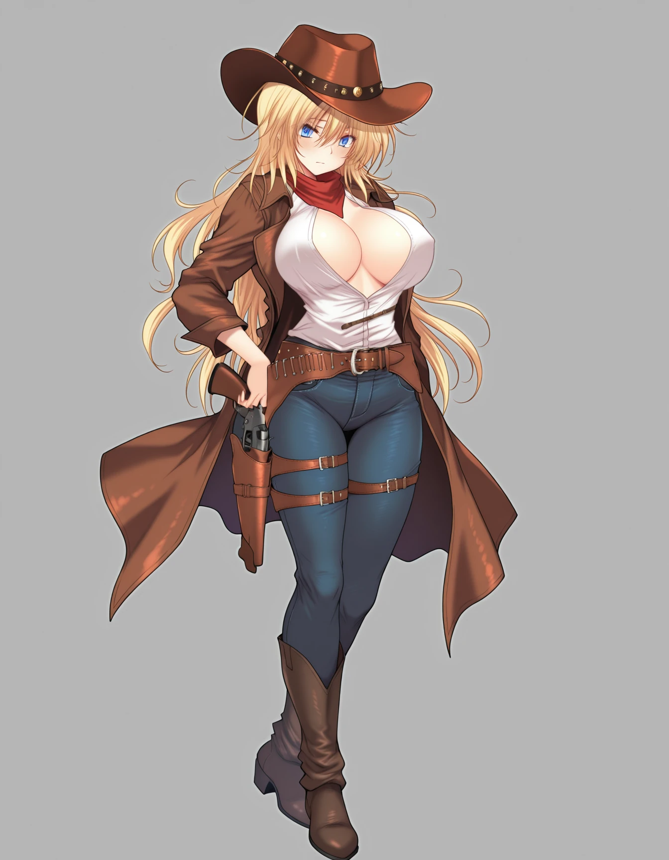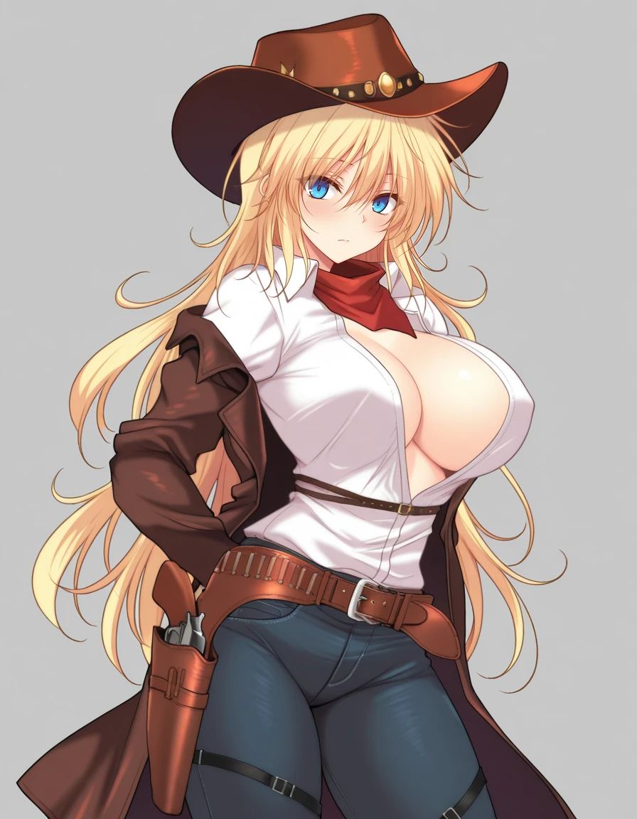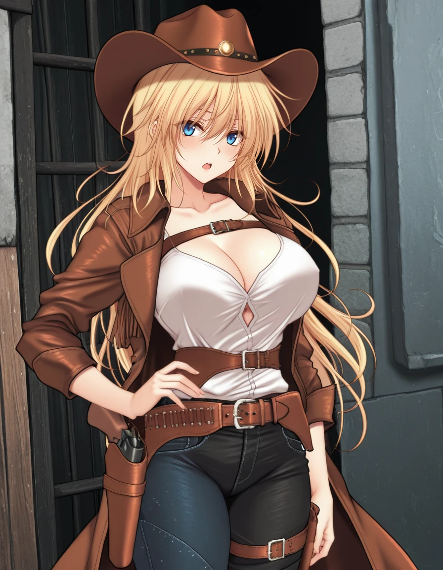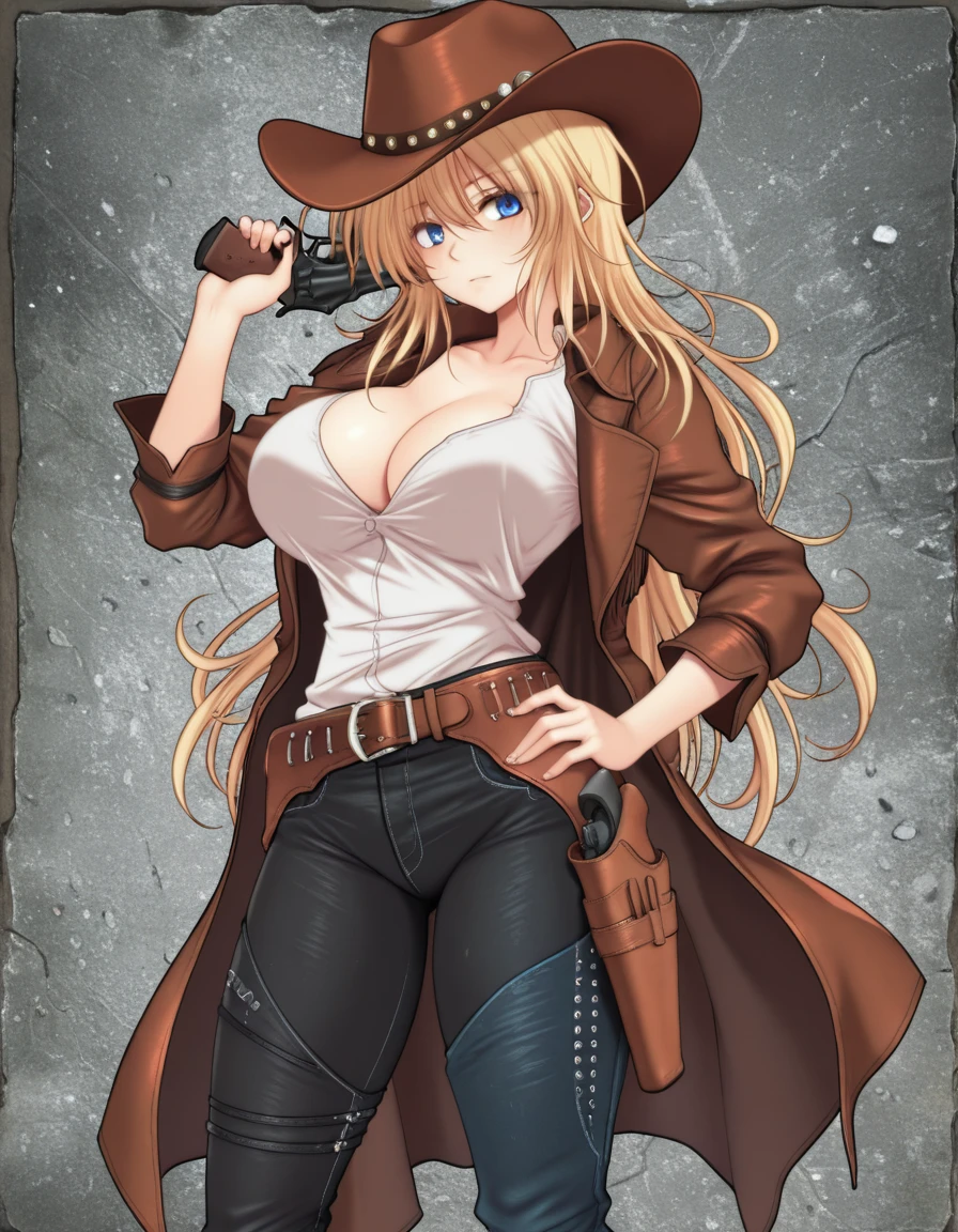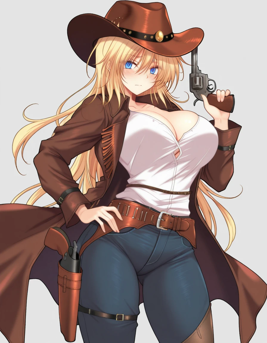 long_hair,blue_eyes,white shirt,large_breasts,blonde_hair,hair_between_eyes,open_clothes,belt,buckle,handgun,open_coat,asymmetrical_legwear,jeans,blue_pants,brown_belt,holster,cowboy_hat,revolver,holstered,cowboy_western,