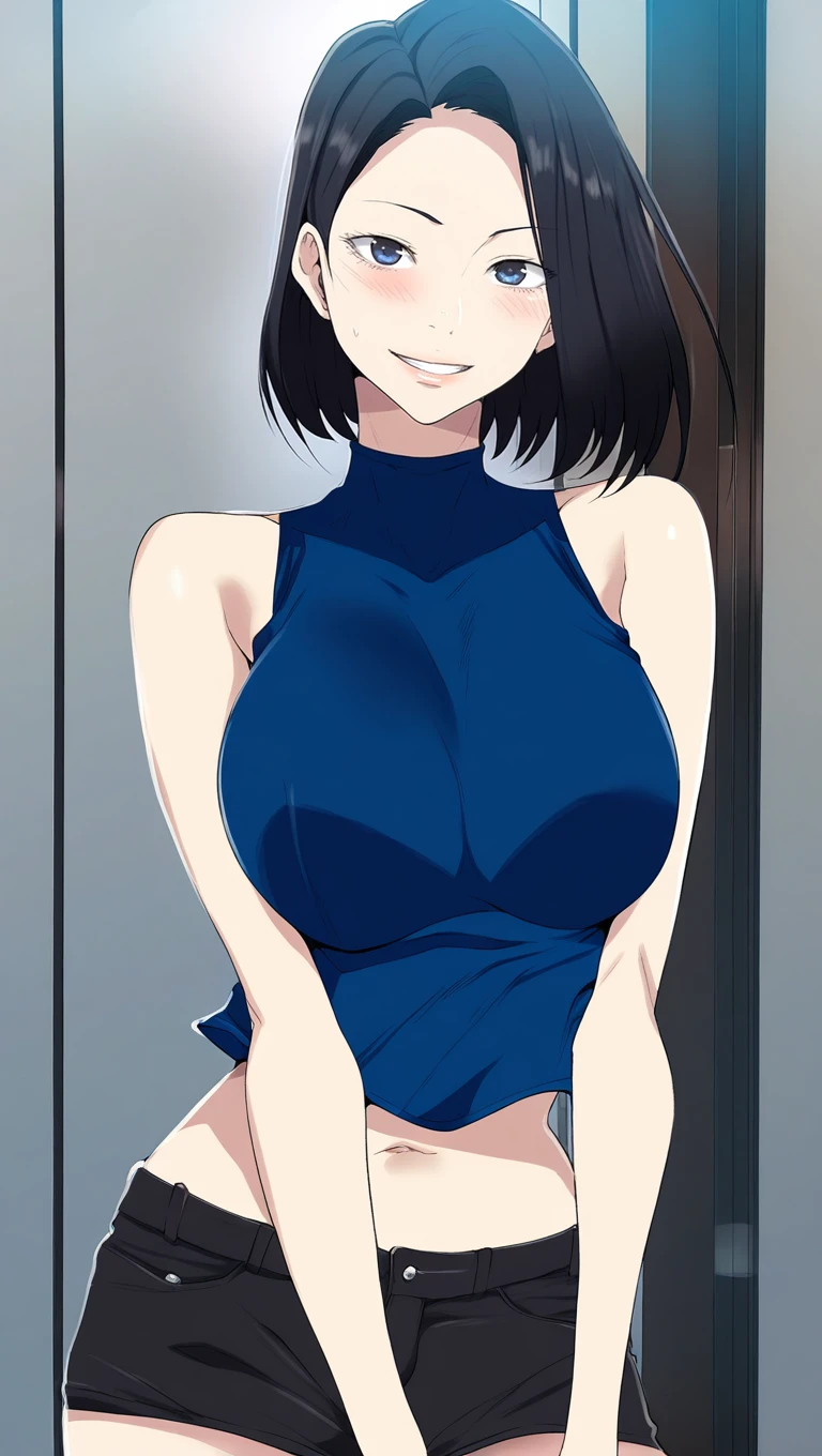 casual outfit 3, blue shirt, black jean shorts, bare shoulders, breasts, large breasts, cleavage, navel, midriff,