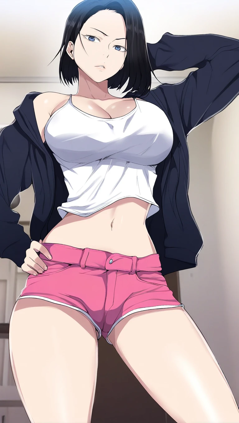 casual outfit, white tank top, black sweatshirt, pink short shorts, breasts, large breasts, cleavage, navel, midriff,