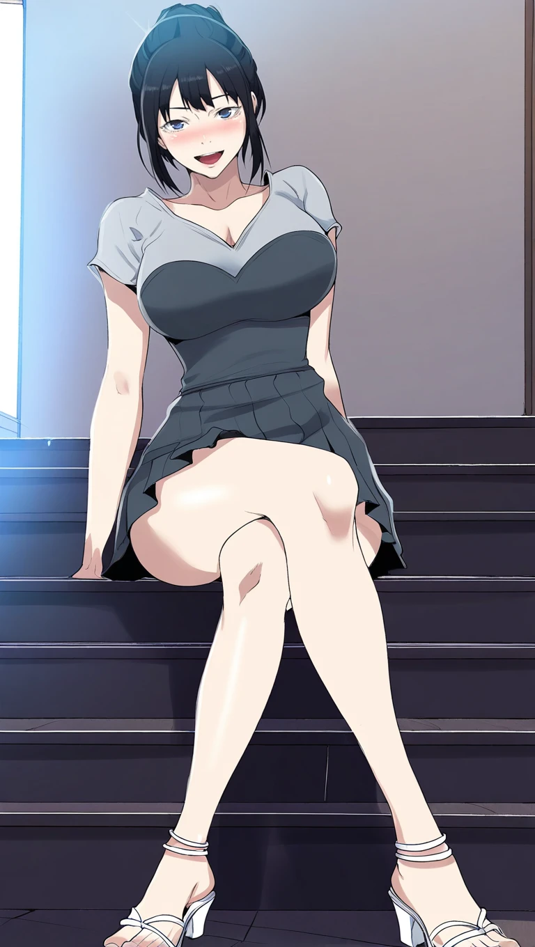 dress outfit, black and grey dress, short sleeves, high heels, sandals, white sandals, pleated skirt, breasts, large breasts,