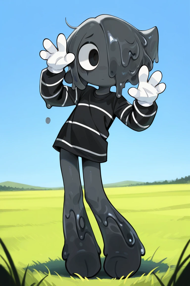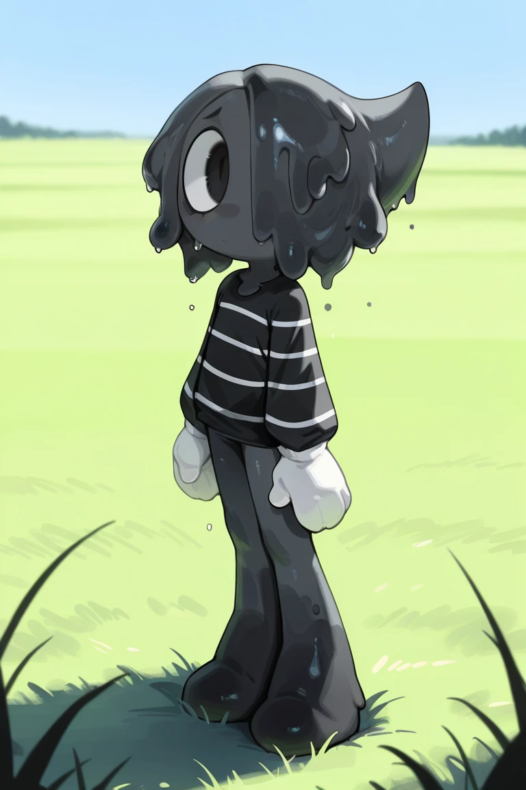 Useful tags: blotdw, dark grey skin, slimy hair over one eye, black eyes, striped black shirt, white gloves