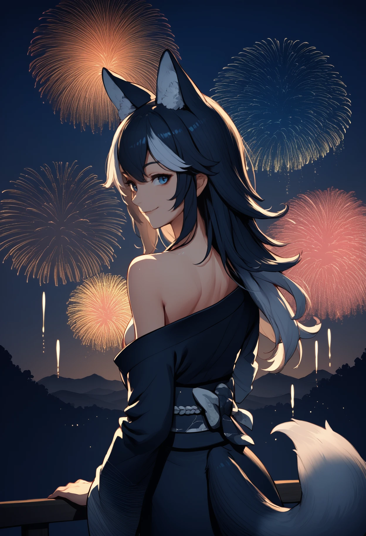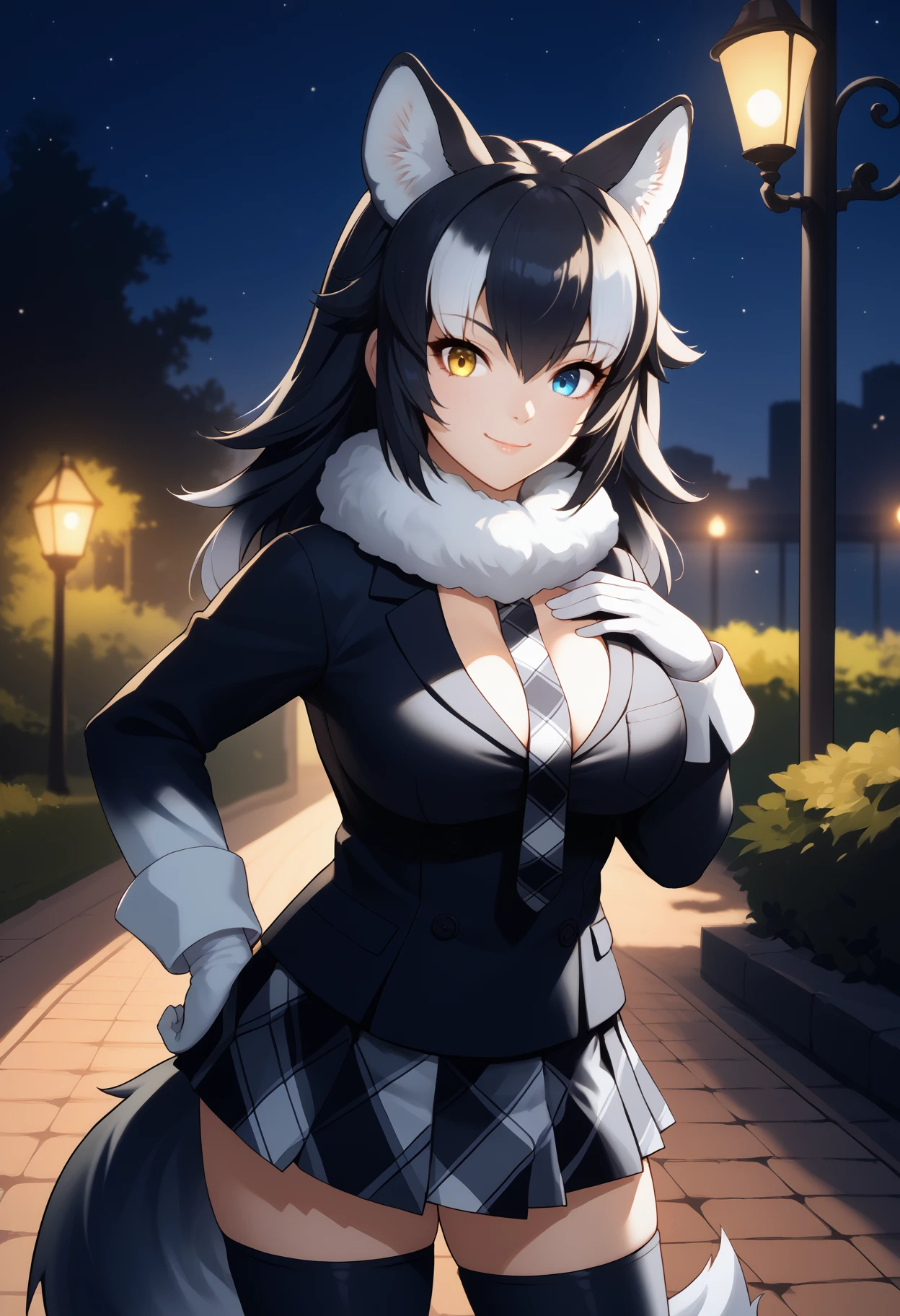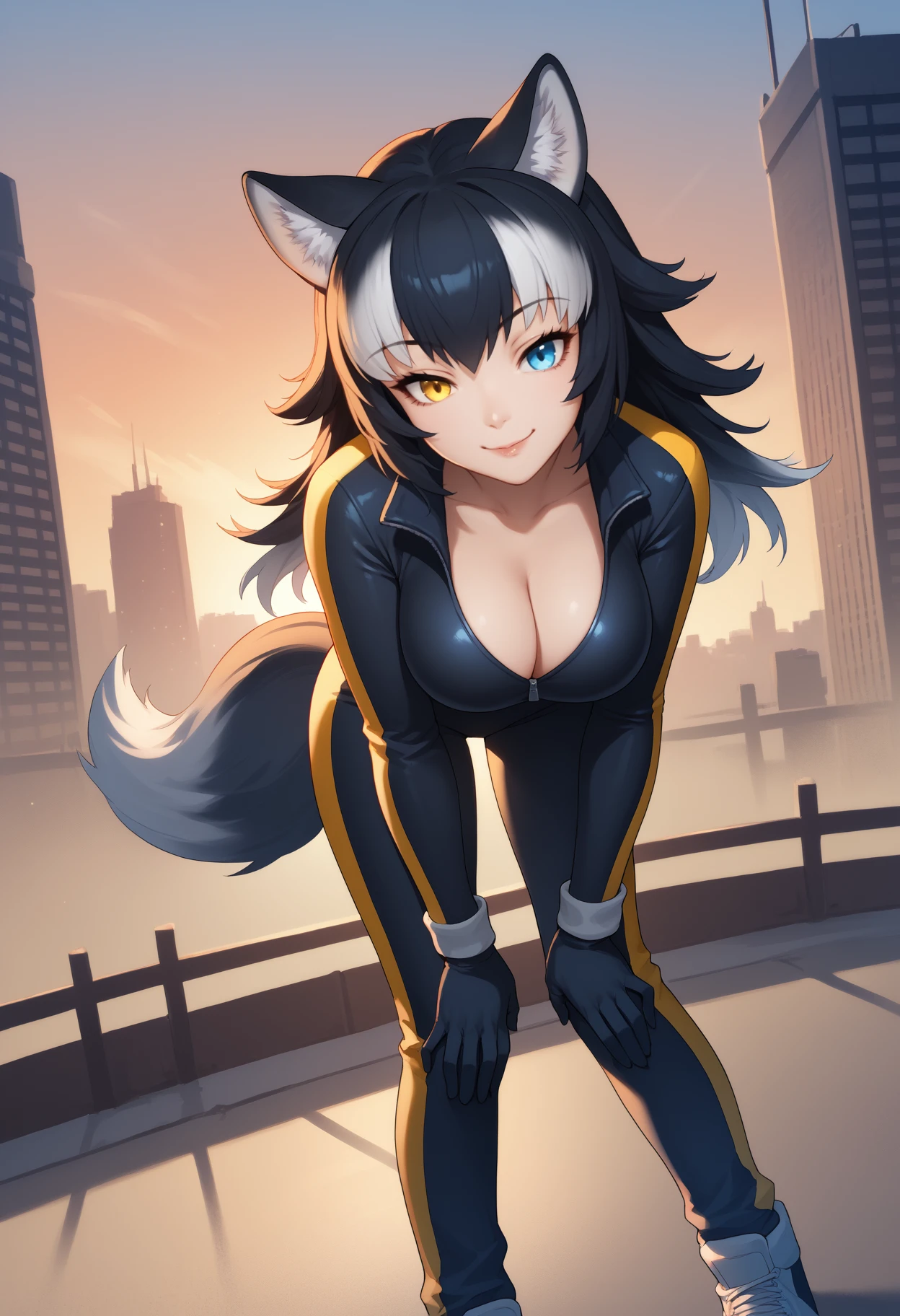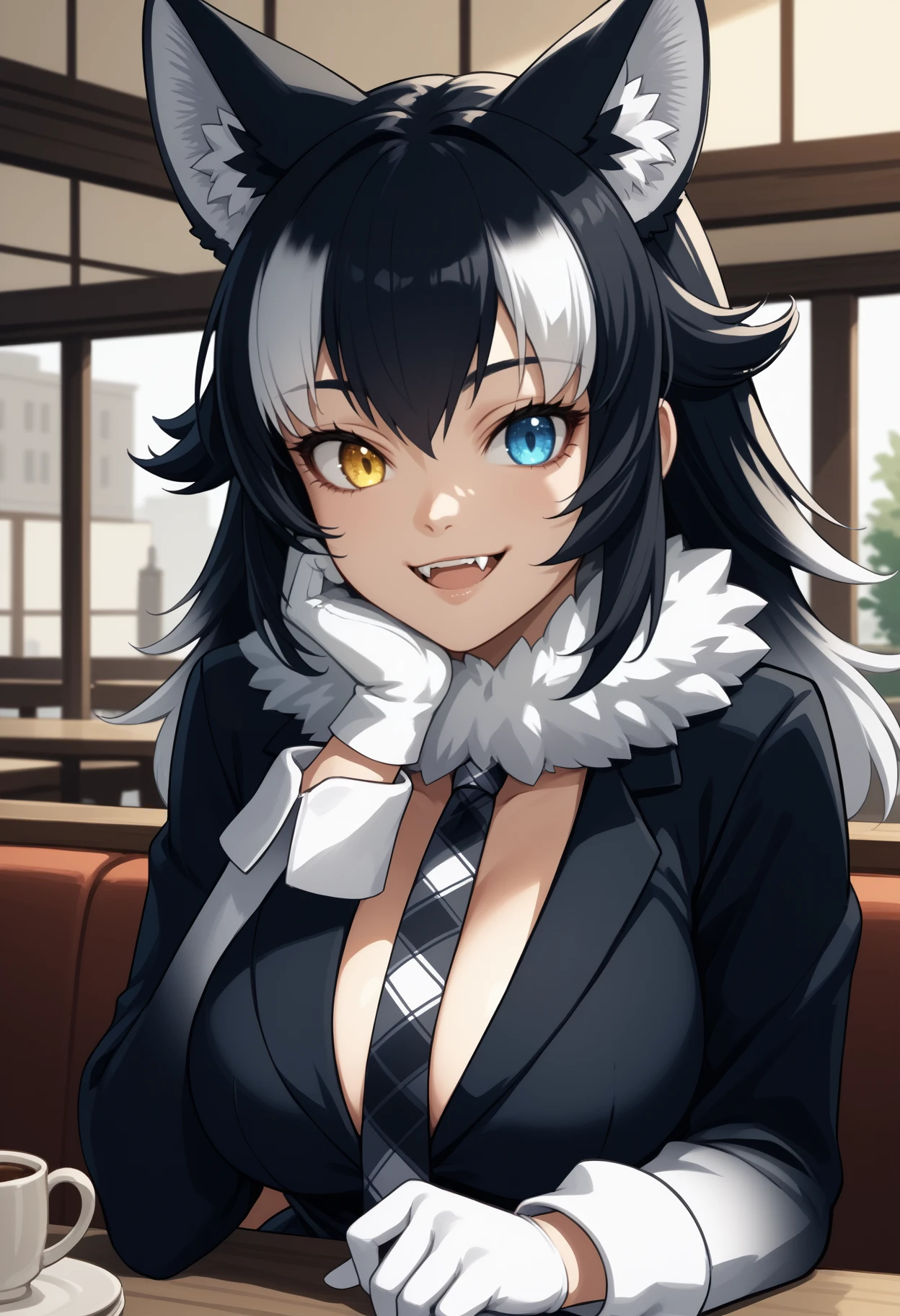 kfgr3yw0lf, wolf tail, long hair, two-tone hair, black hair, white hair, animal ears, animal ear fluff, heterochromia, yellow eyes, blue eyes, large breasts