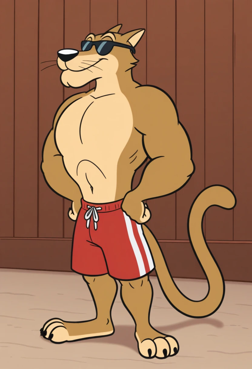 Main outfit: red trunks, sunglasses,