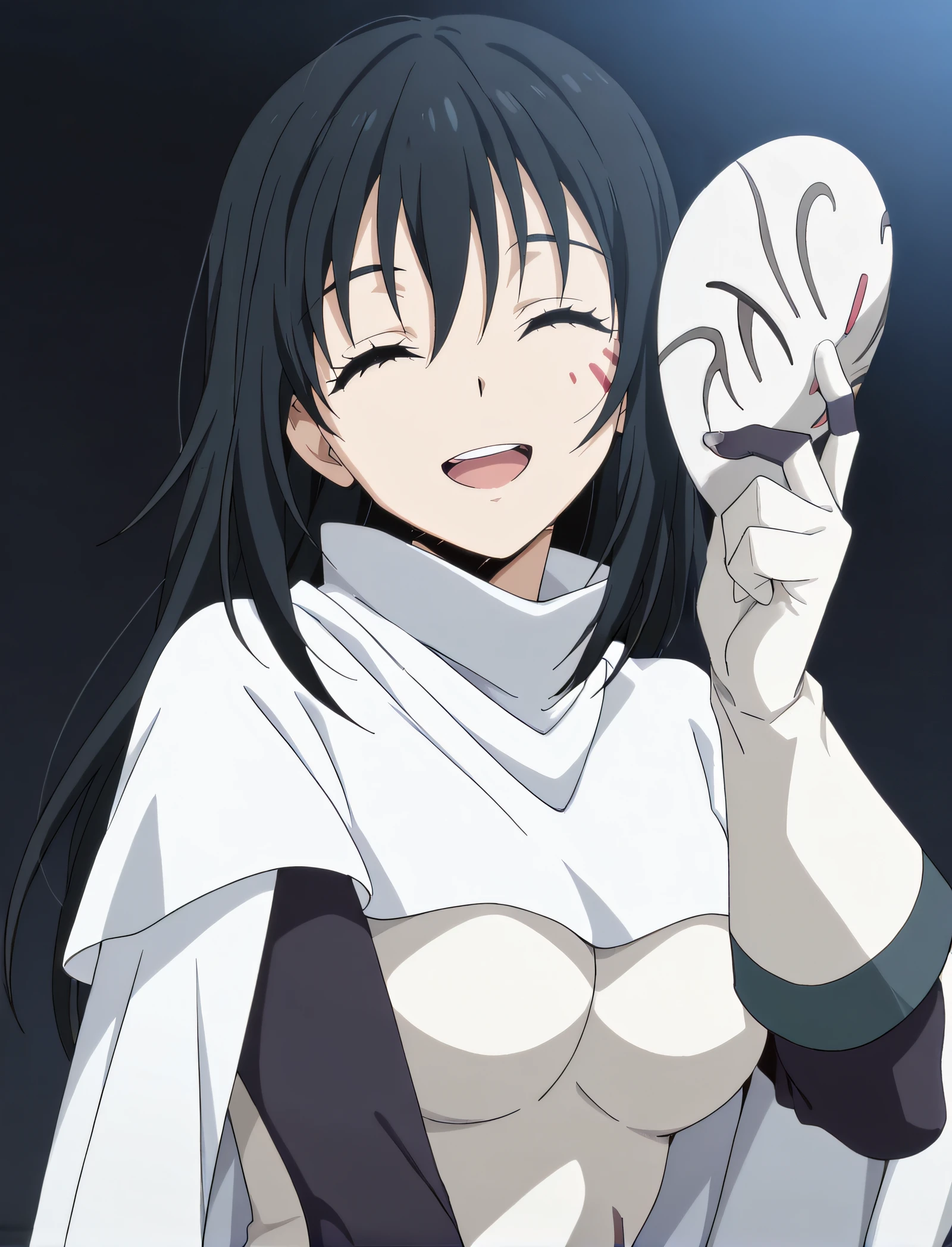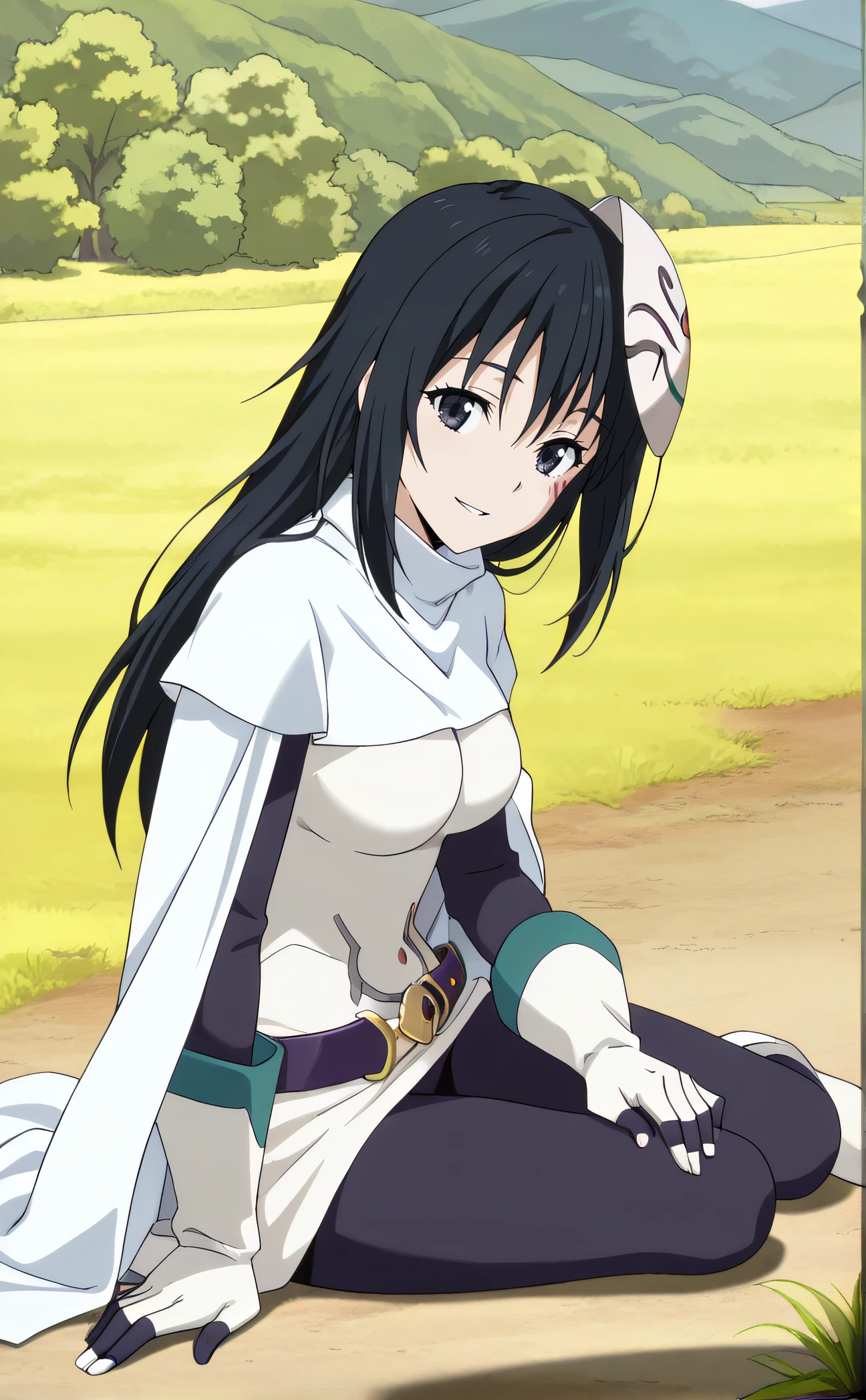 shizu, black hair, long hair, black eyes, facial mark, mask on head, white cape, bodysuit, gloves, belt, shoes, sword