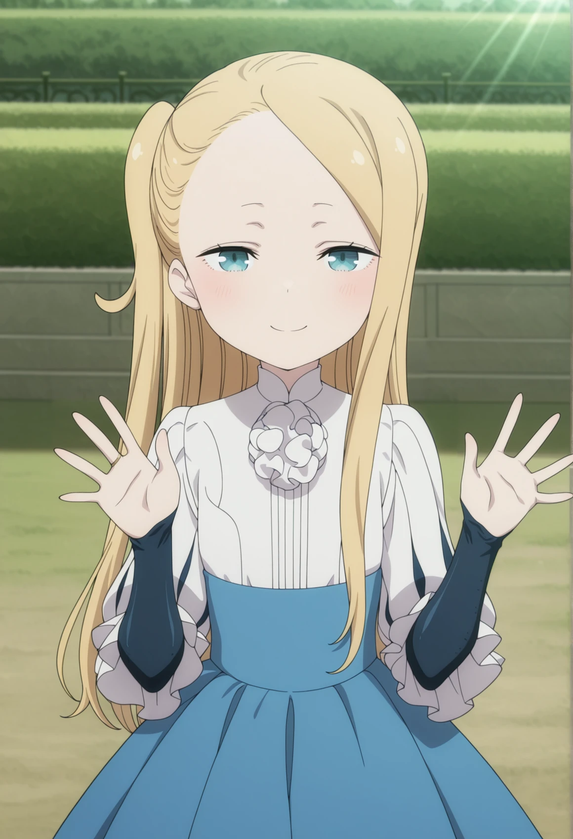 Notable tags: blonde hair, aqua eyes, long hair, side ponytail, single sidelock, forehead, white blouse, blue skirt, bridal gauntlets