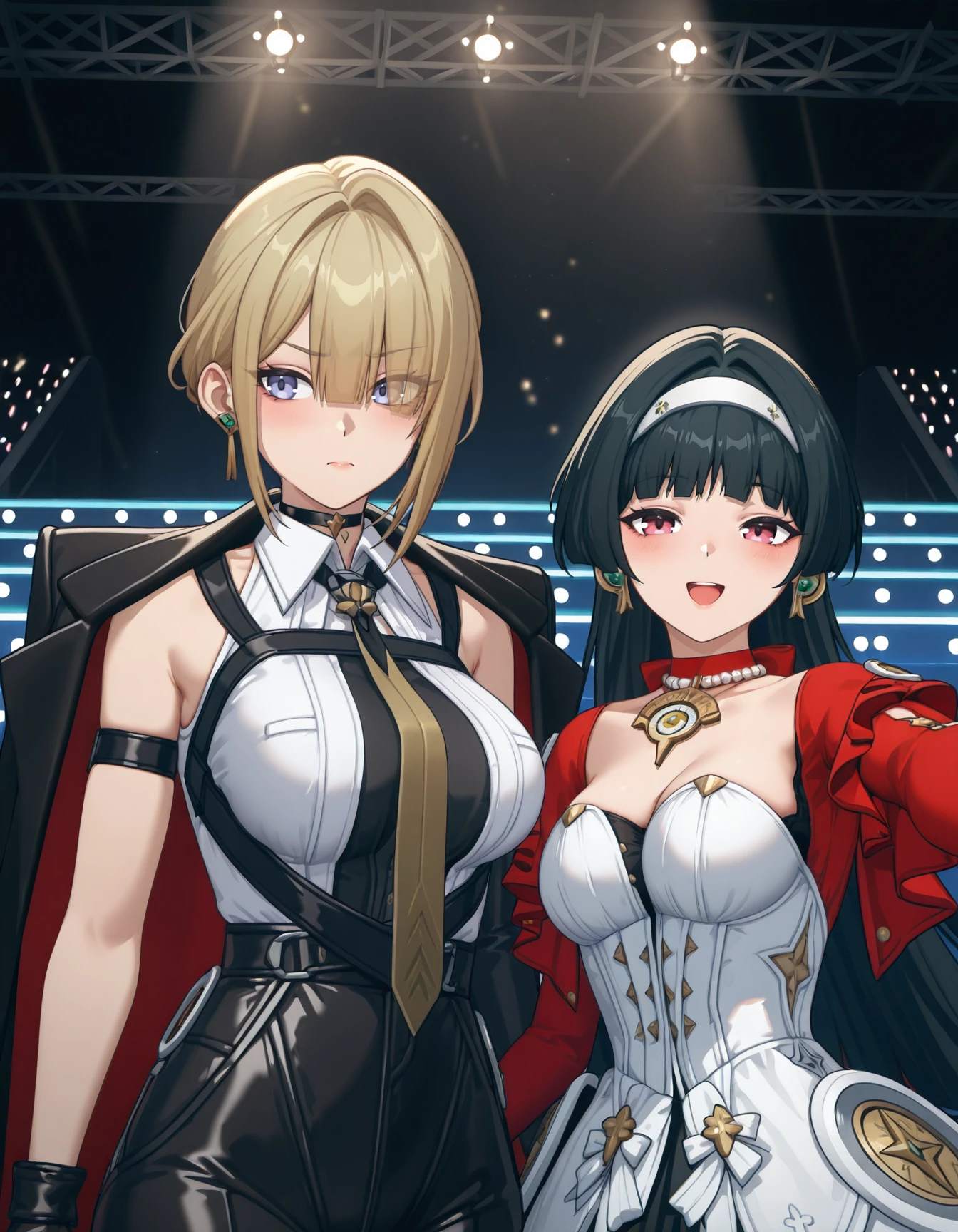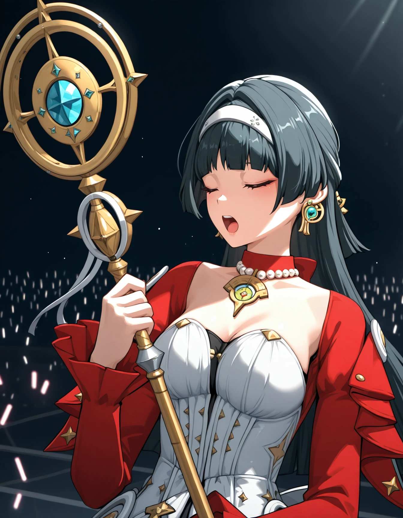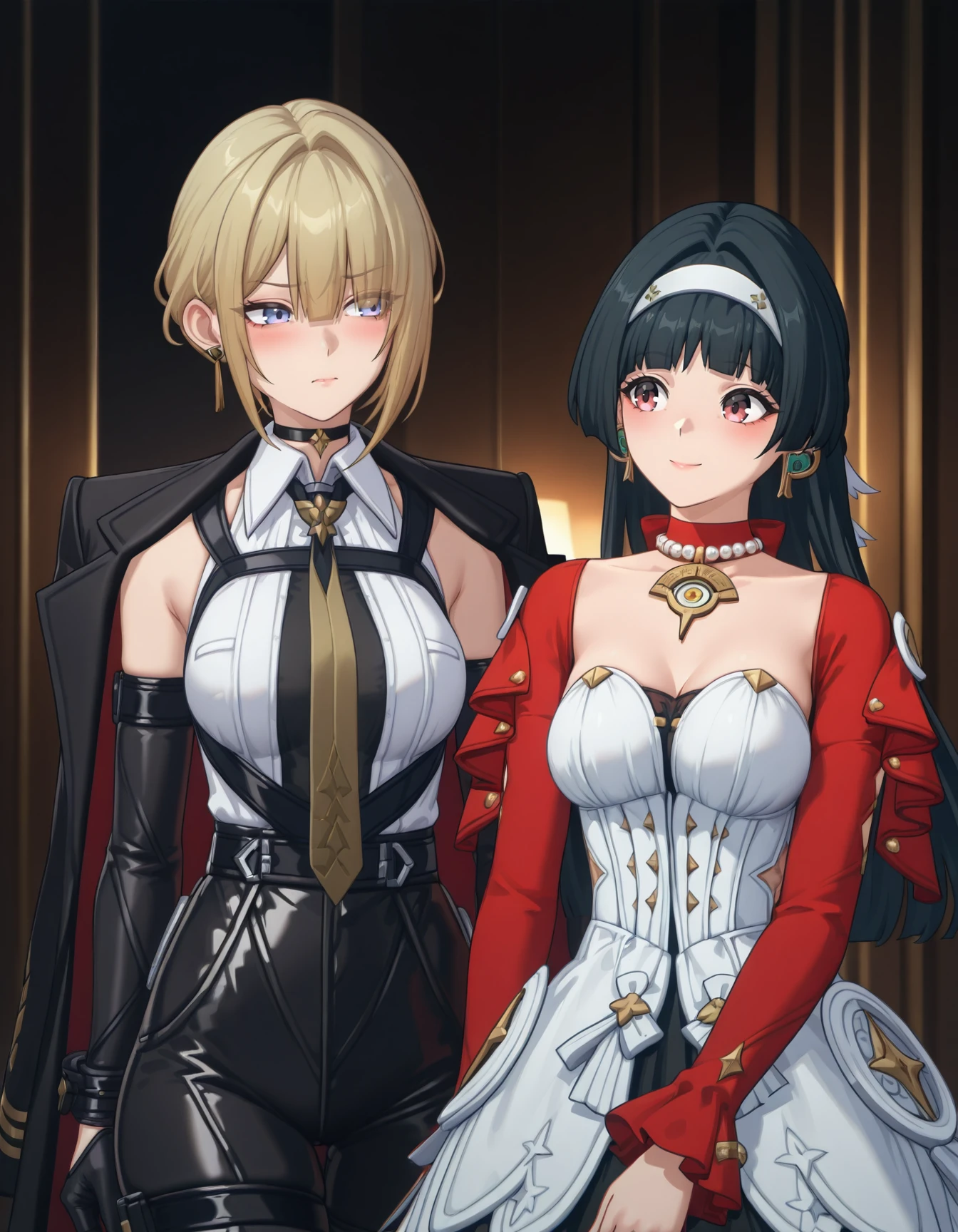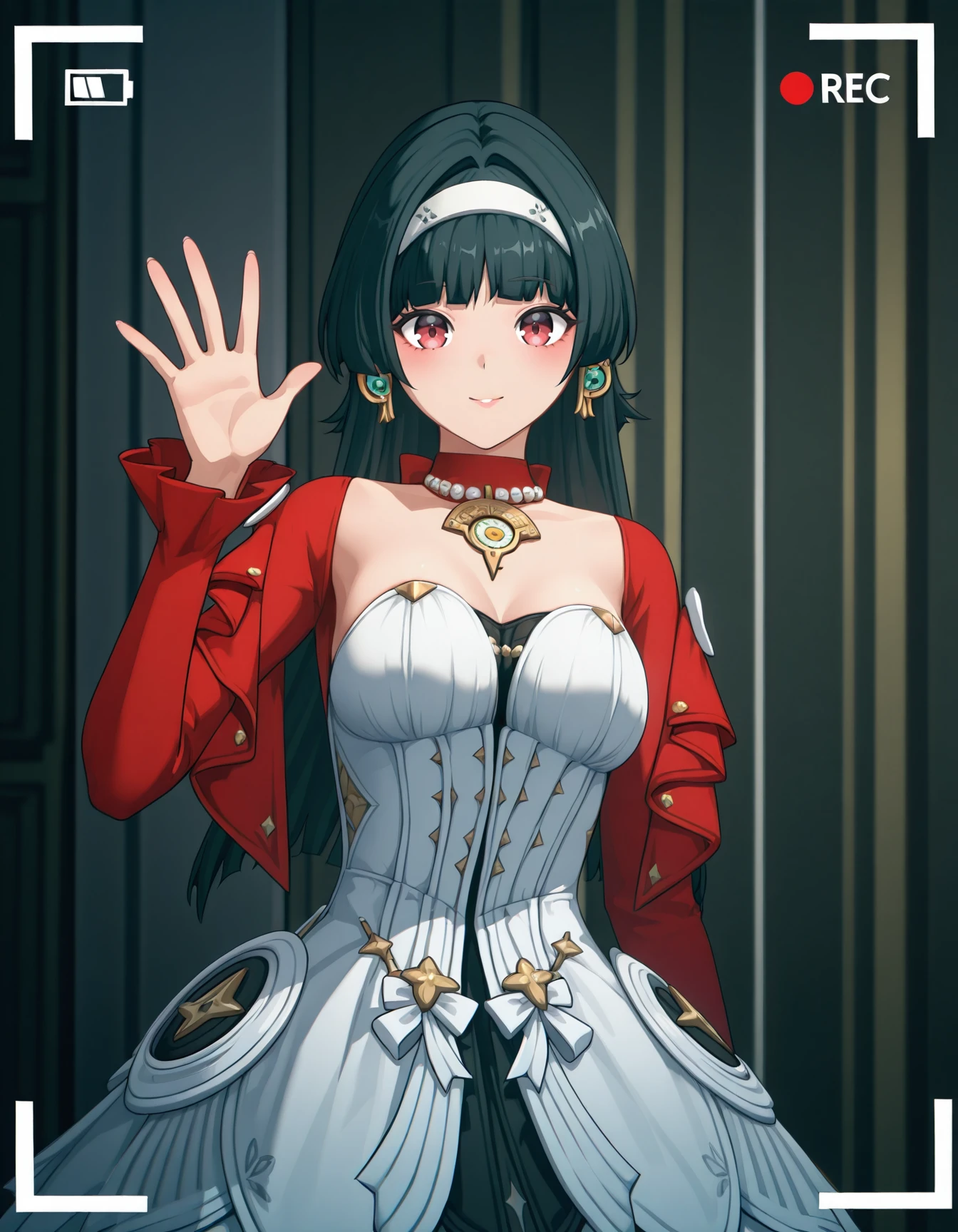 as7r4ya0, black hair, hairband, red choker, necklace, red jacket, strapless dress