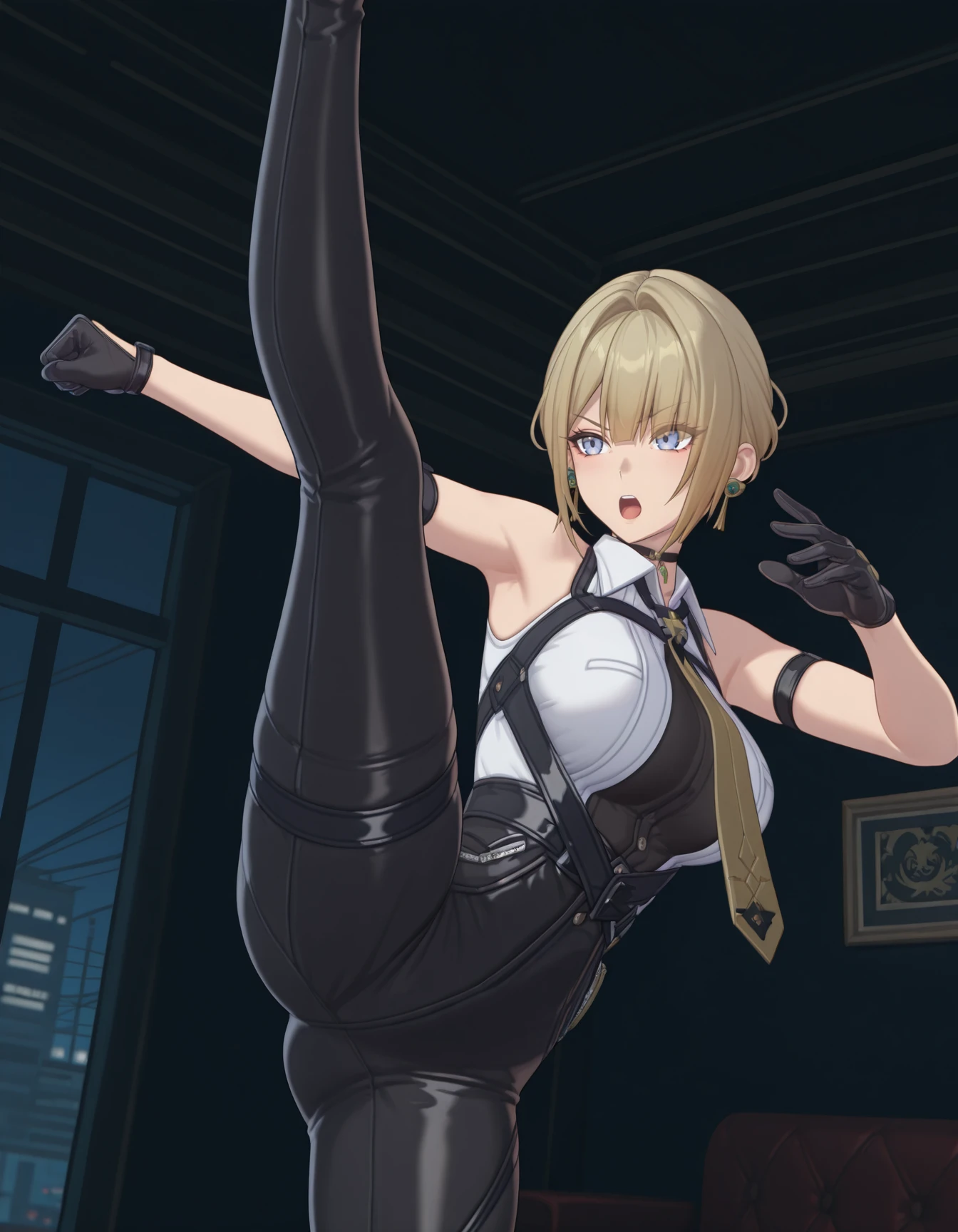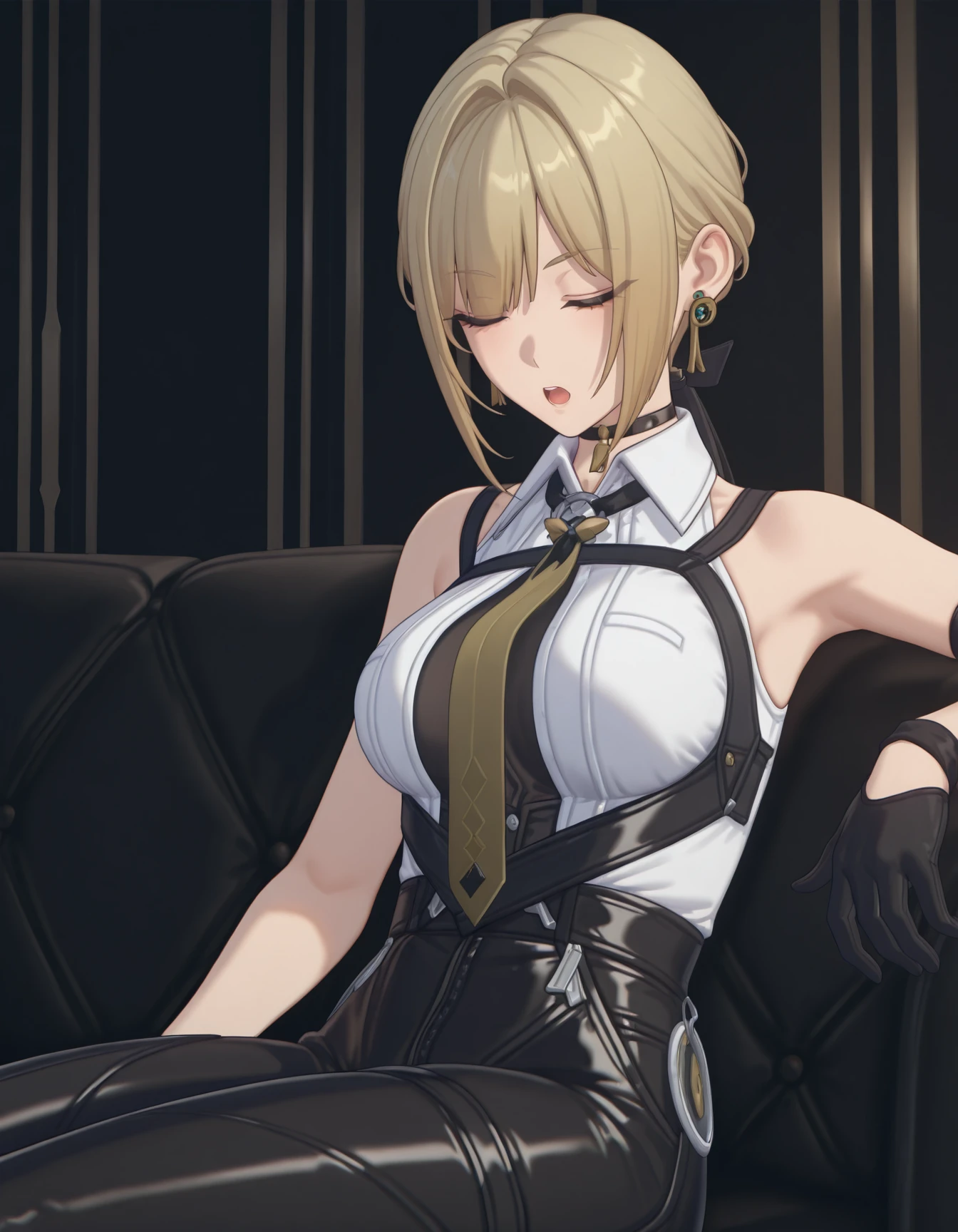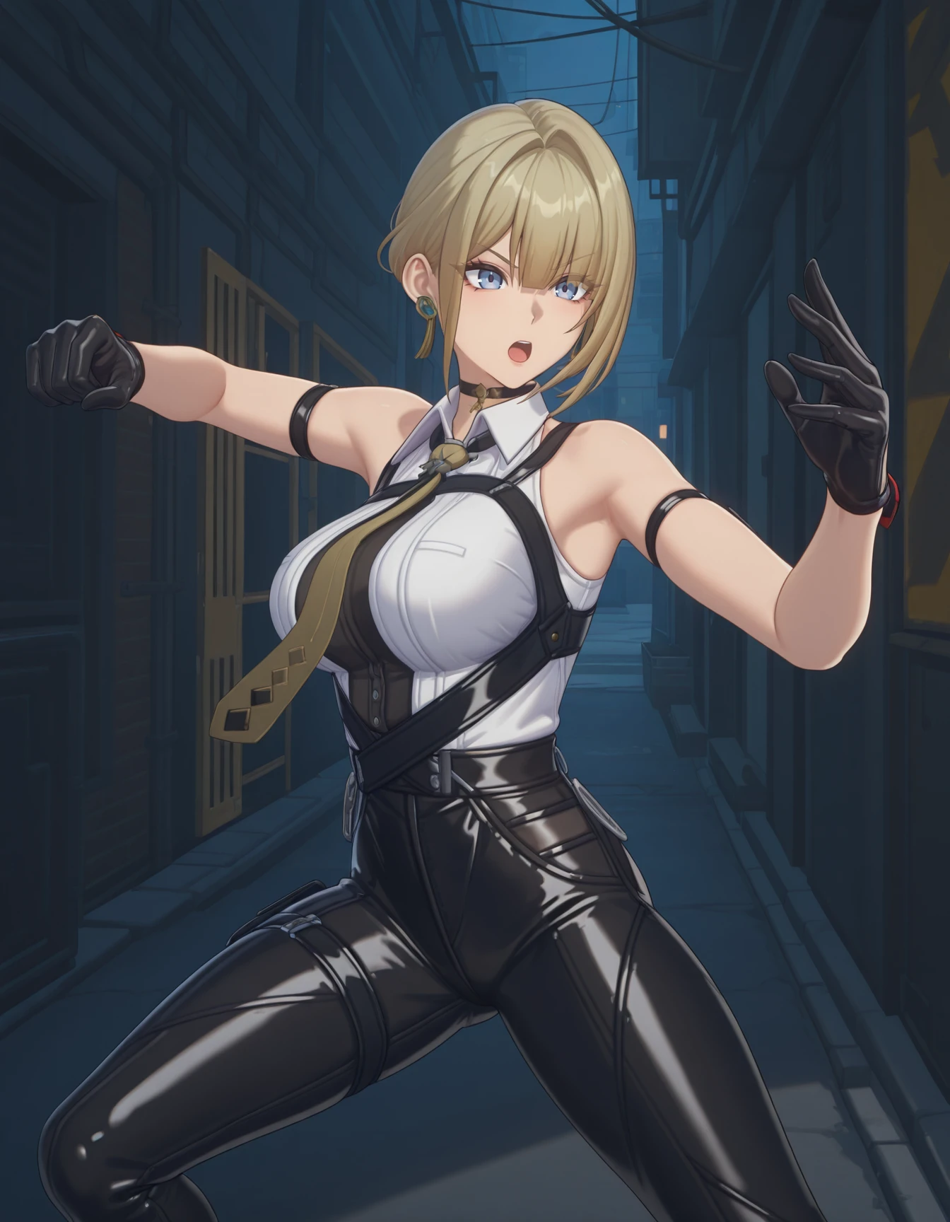 ev3ch3v3l13r, blonde hair, black choker, earrings, sleeveless shirt, necktie, high-waist pants, gloves