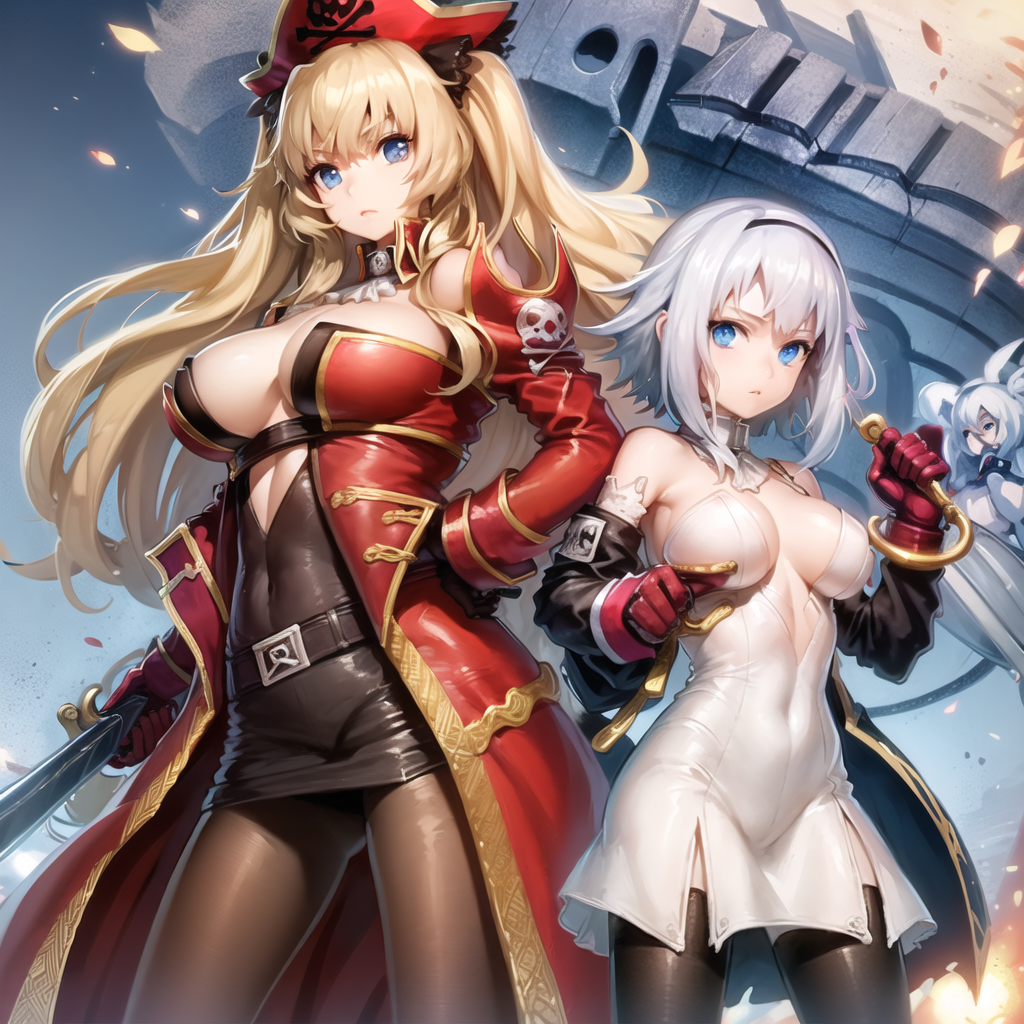 a cartoon of a lady with sword is standing next to an anime man, multiple girls, weapon, blonde hair, 2girls, sword, breasts, pantyhose, long hair, white hair, blue eyes, pirate, large breasts