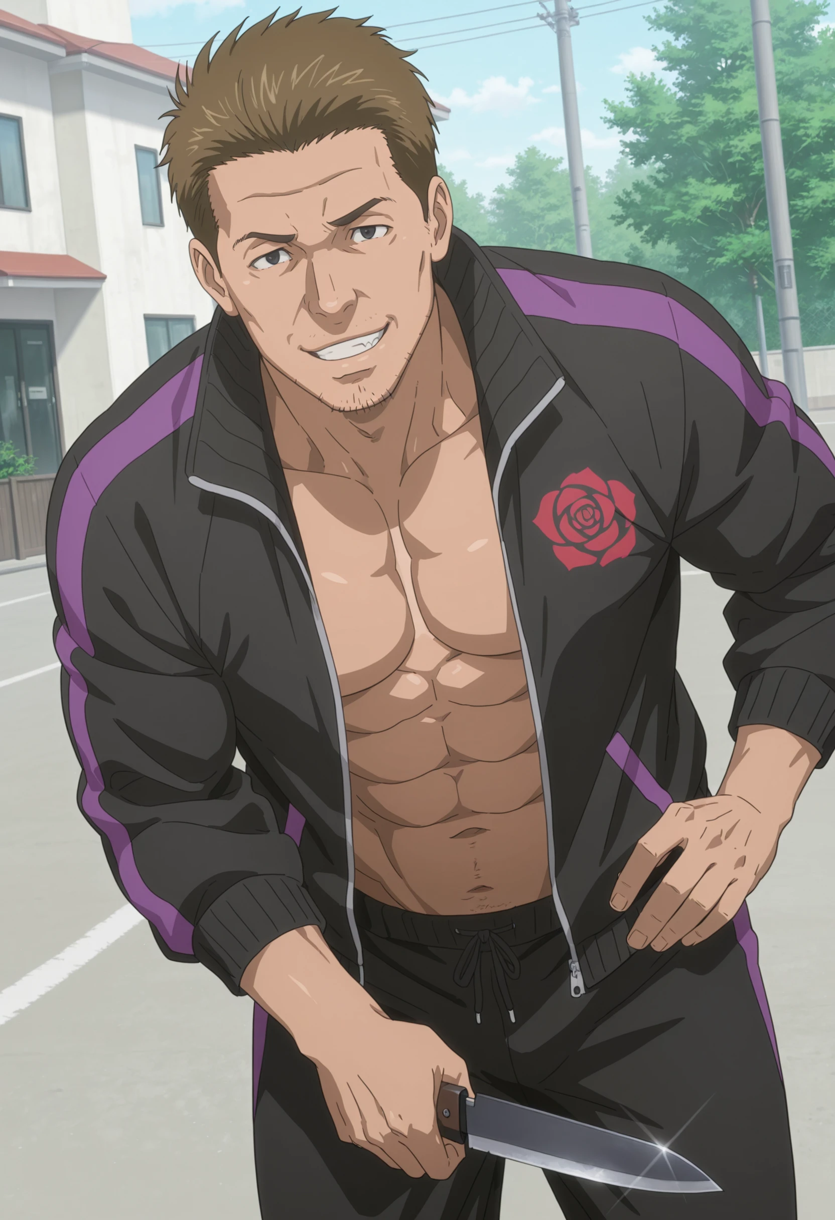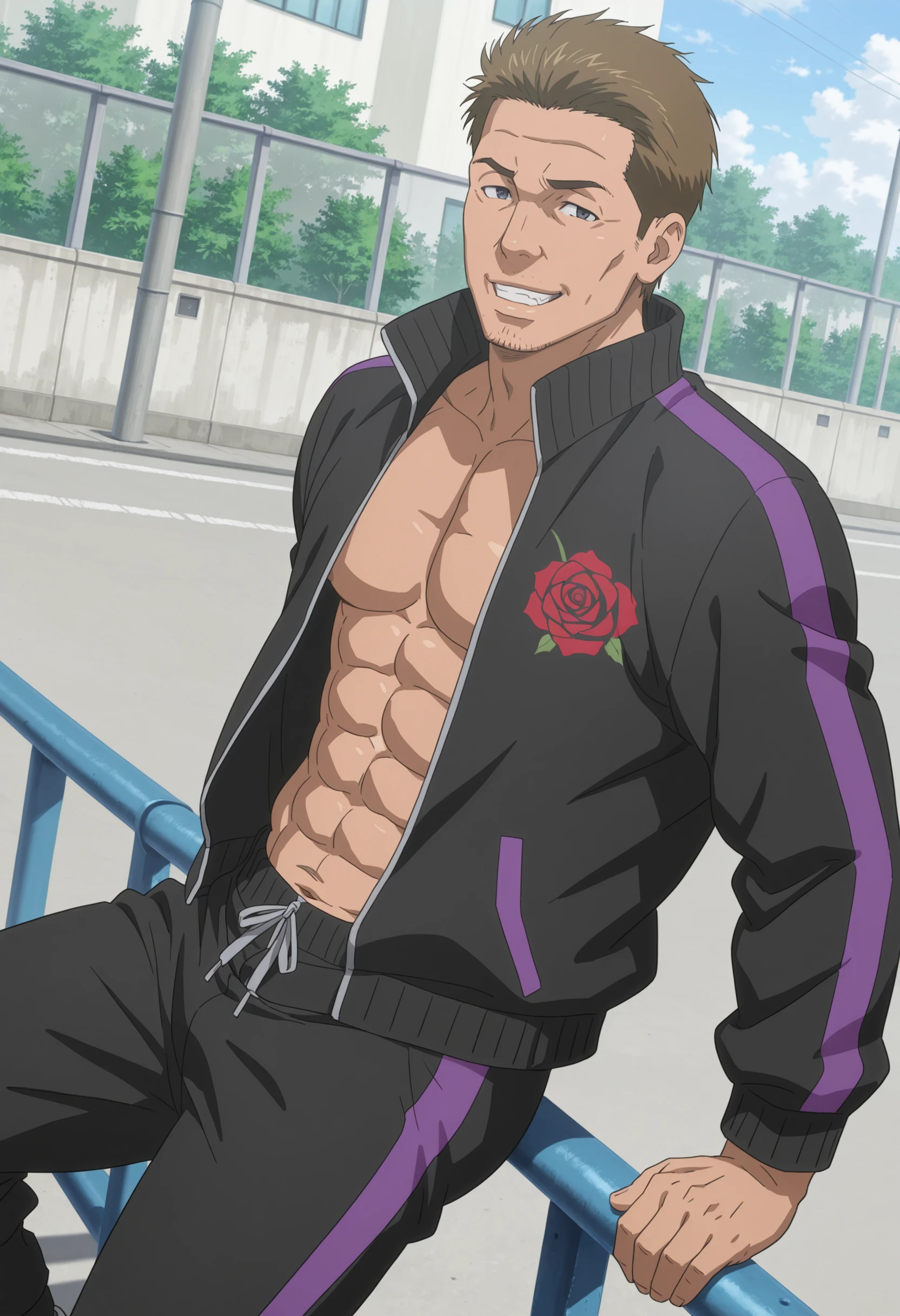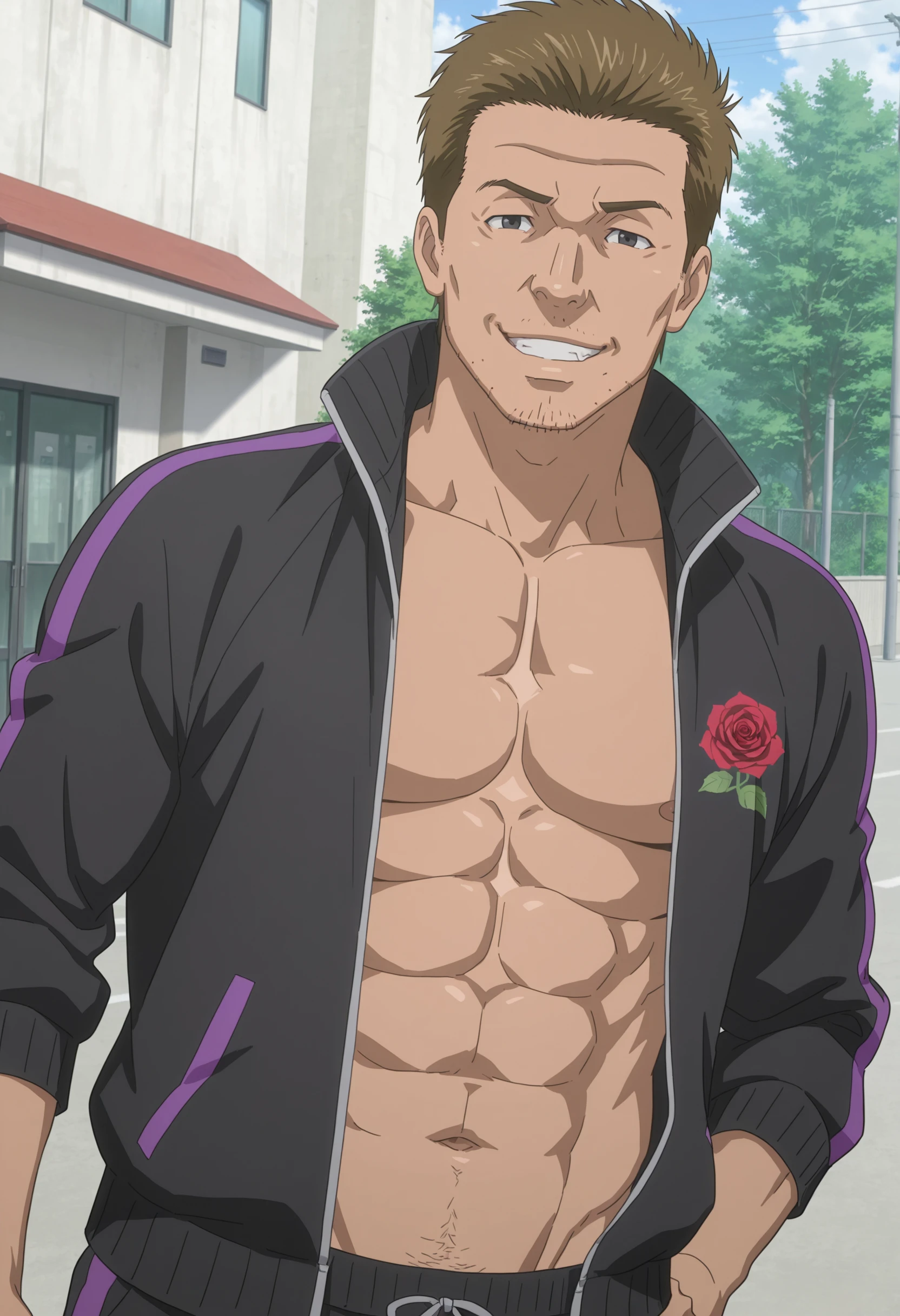 short brown hair, stubble, black eyes, black tracksuit with purple stripes and red rose symbol,