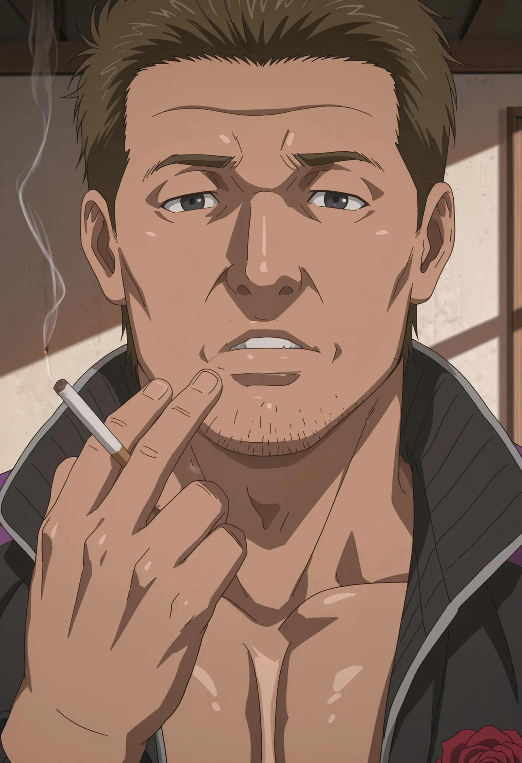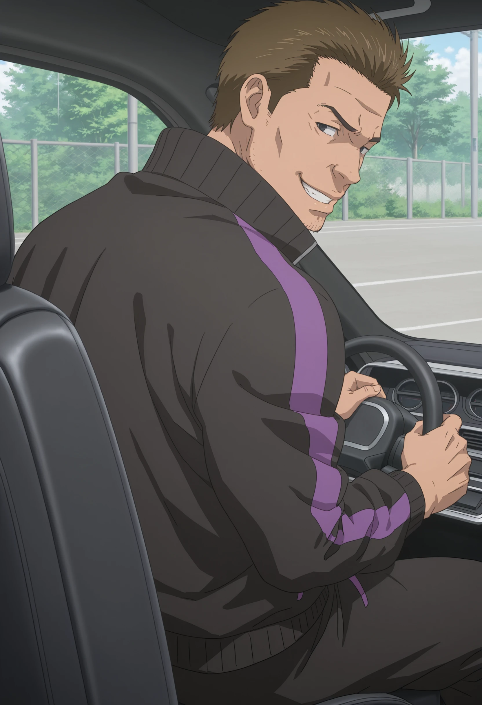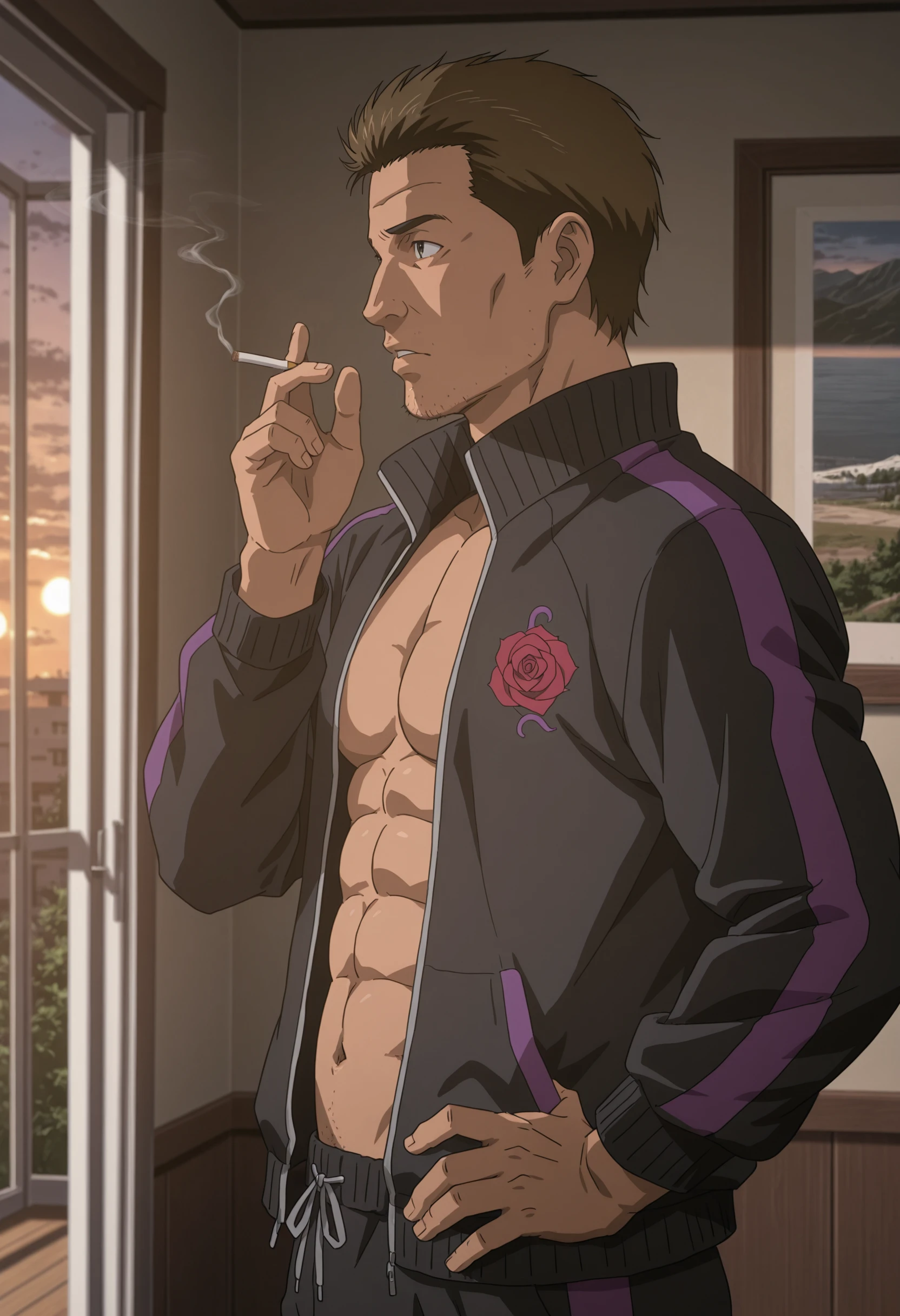 short brown hair, stubble, black eyes, black tracksuit with purple stripes and red rose symbol,