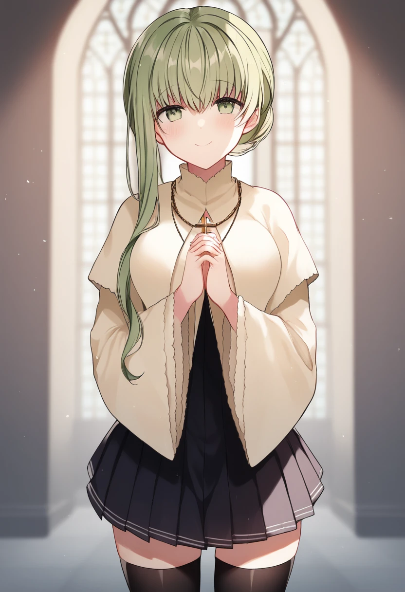 Saint outfit: white capelet, sleeves past wrists, cross necklace, pleated skirt, black skirt, miniskirt, black thighhighs, wide sleeves, saint outfit, cross necklace,