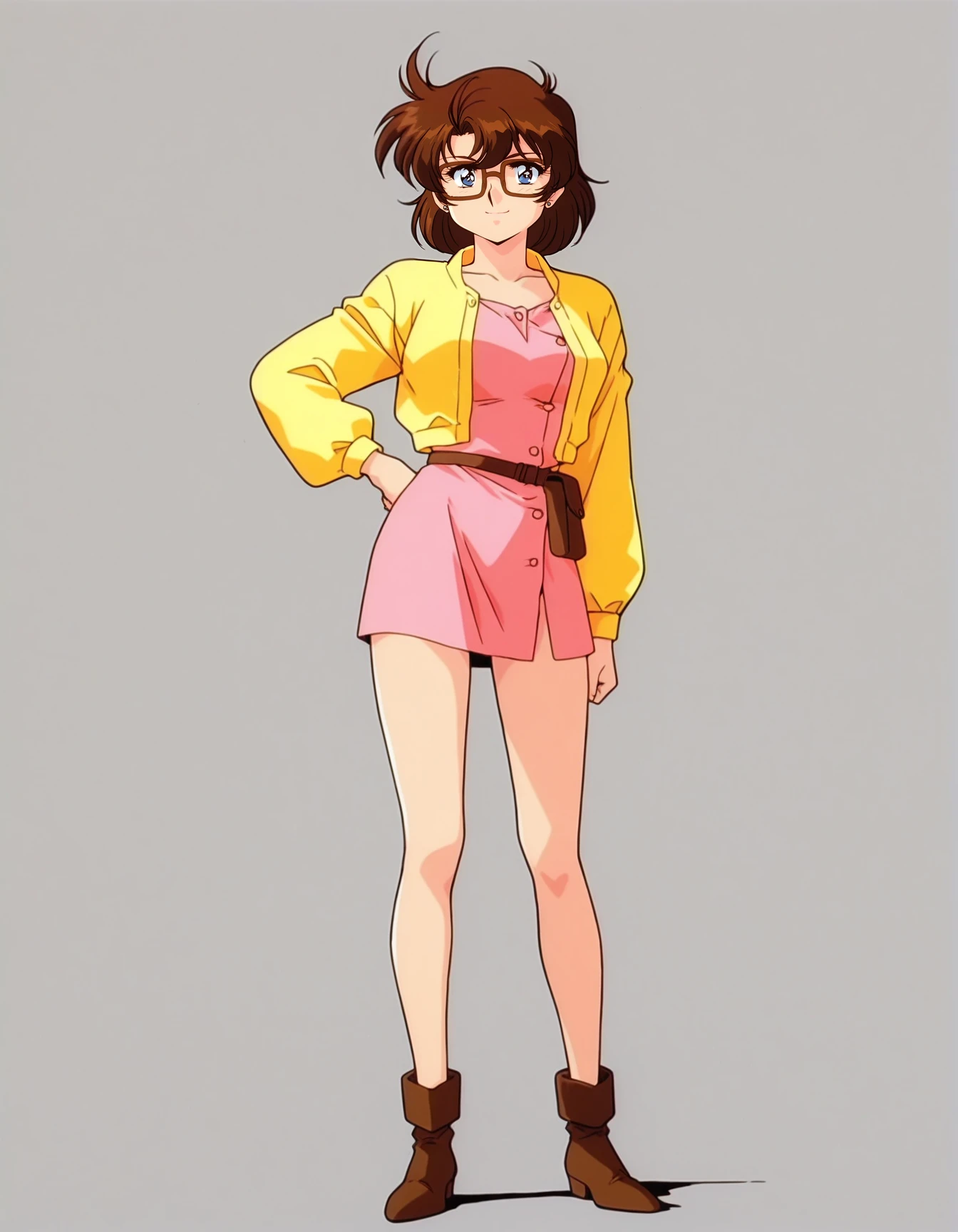 mai_shionsd,short_hair,brown_hair,blue_eyes,brown-framed_eyewear,stud_earrings,long_sleeves,yellow_jacket,open_clothes,short_dress,pink_dress,ankle_boots,brown_footwear