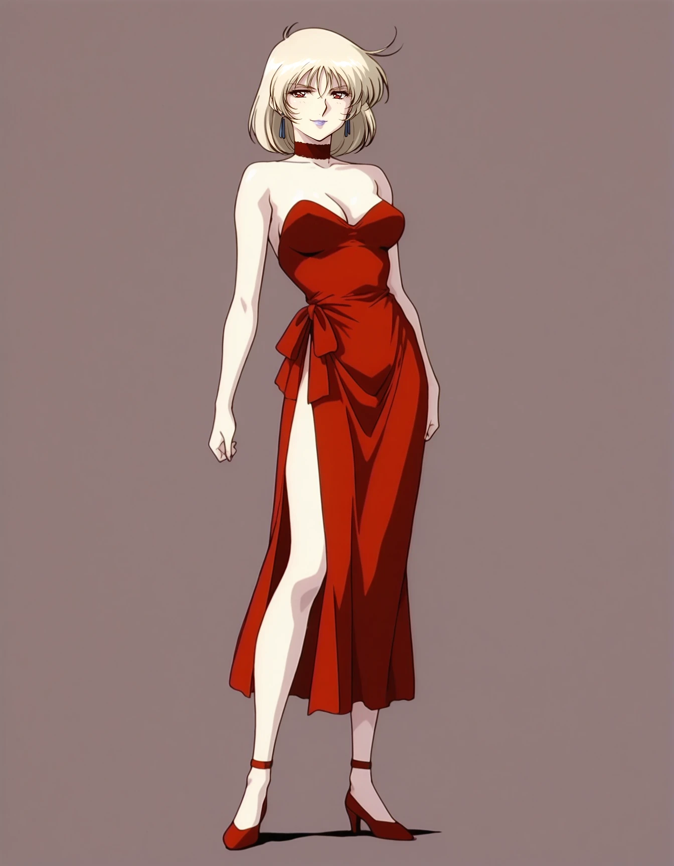 mai_vanessasd,short_hair,blonde_hair,red_eyes,bare_shoulders,earrings,choker,purple_lips,strapless_dress,red_dress,long_dress,side_cutout,cleavage