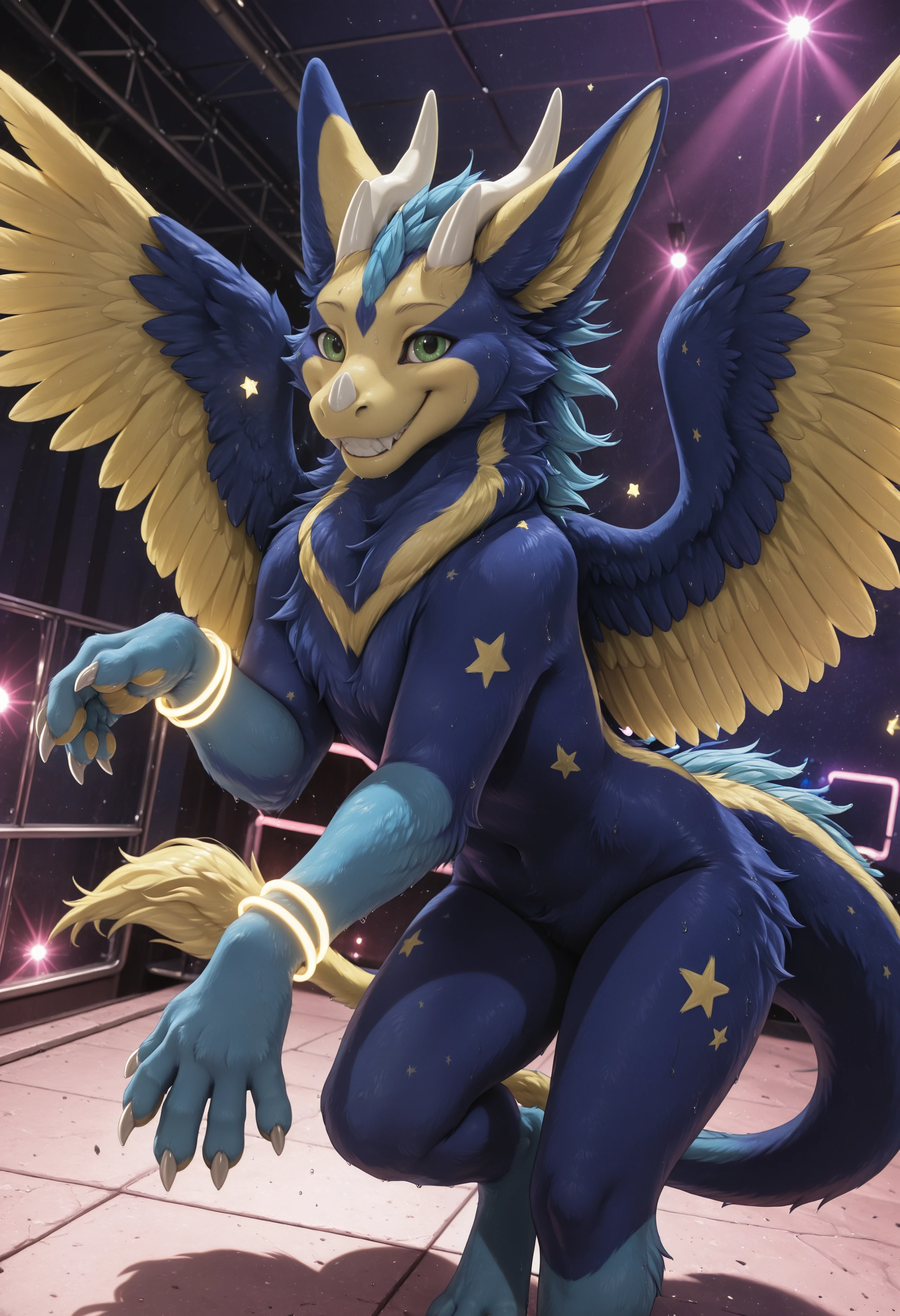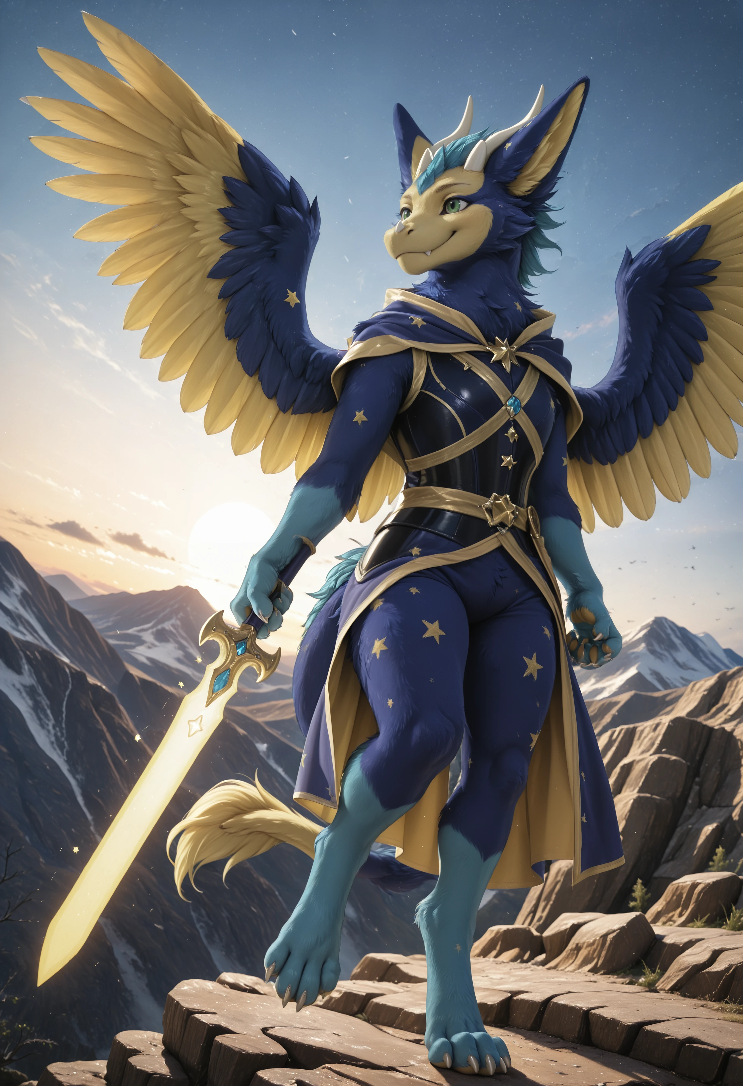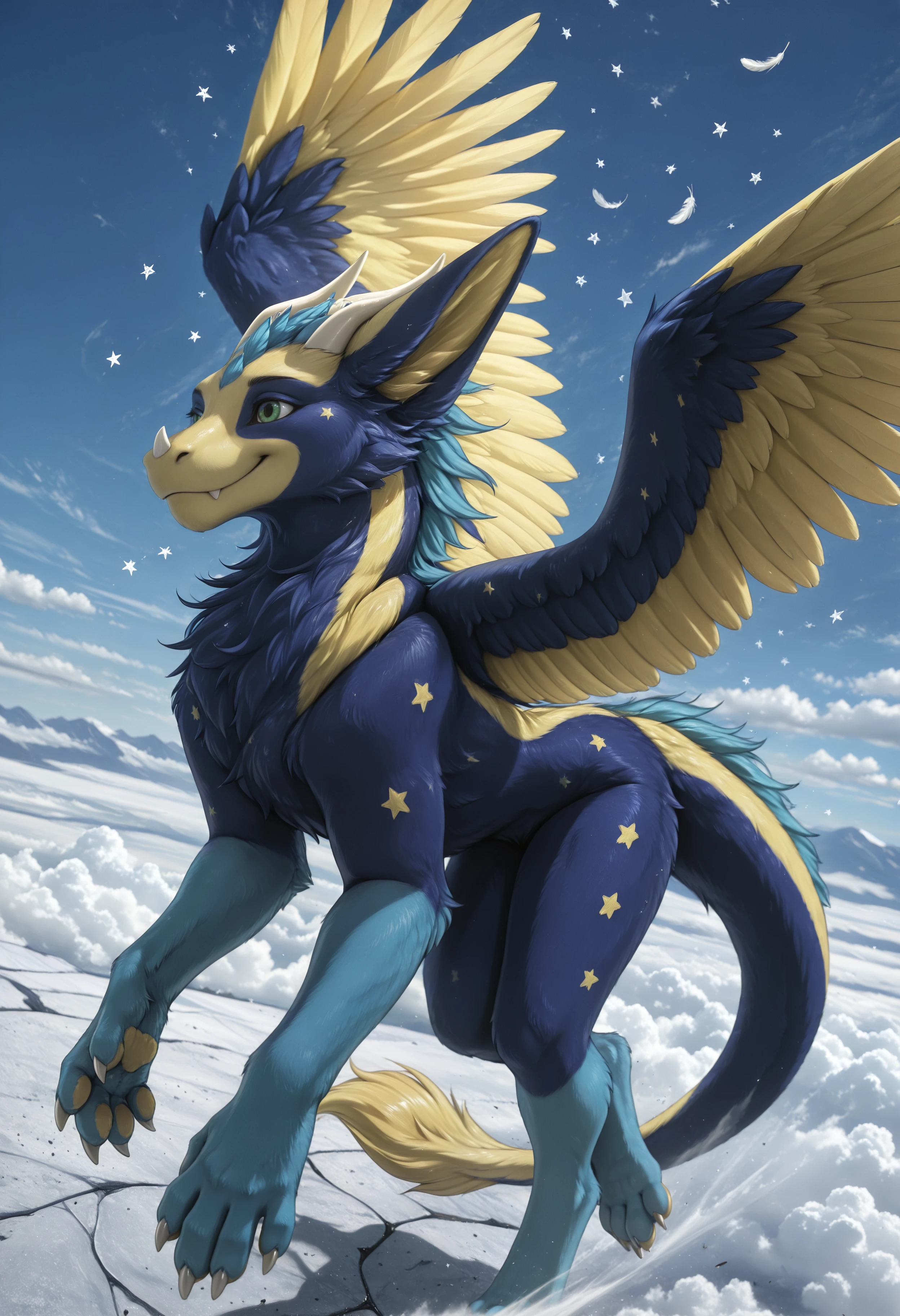 dust4r_0c, dragon, angel dragon, solo, blue body, yellow body, star (symbol), no humans, wings, feathers, green eyes, furry, blue fur, fur, feral, feathered wings, tail, claws, horns, looking at viewer, furred dragon