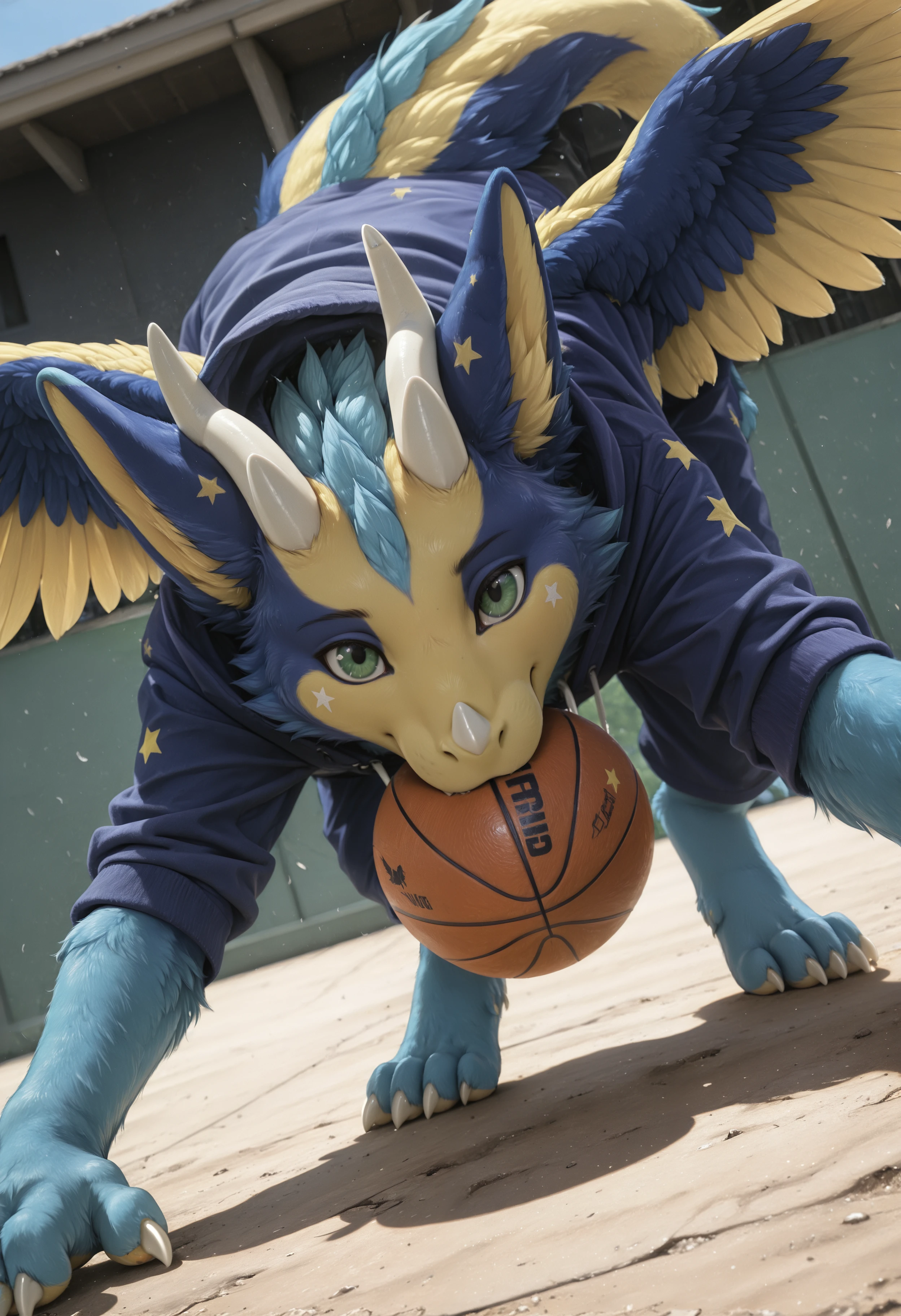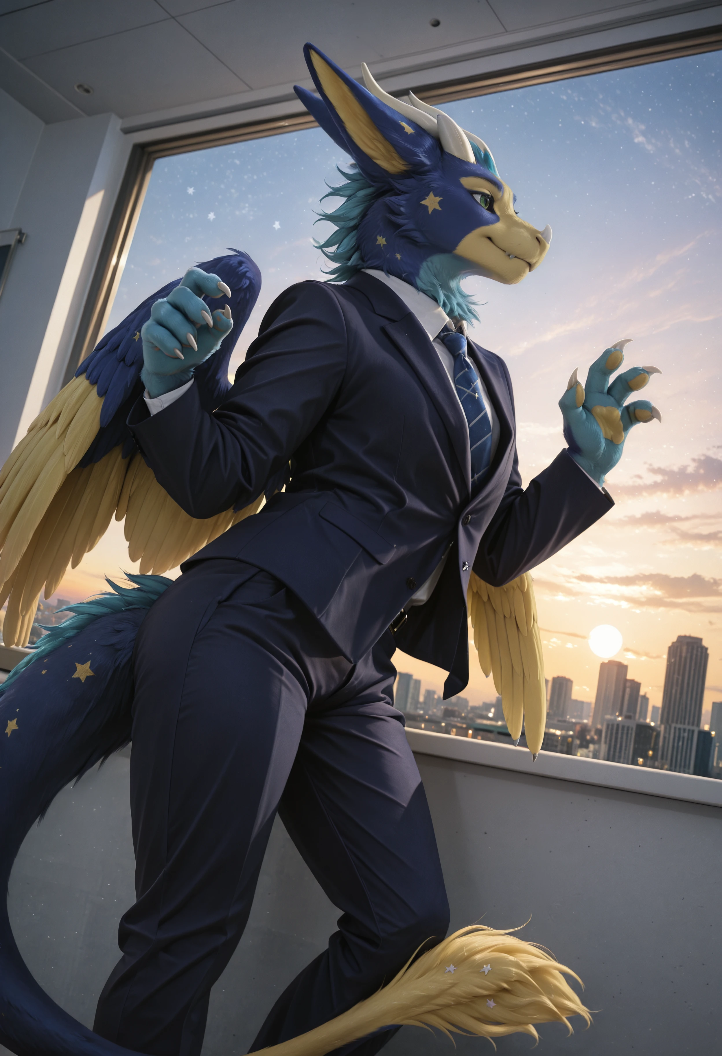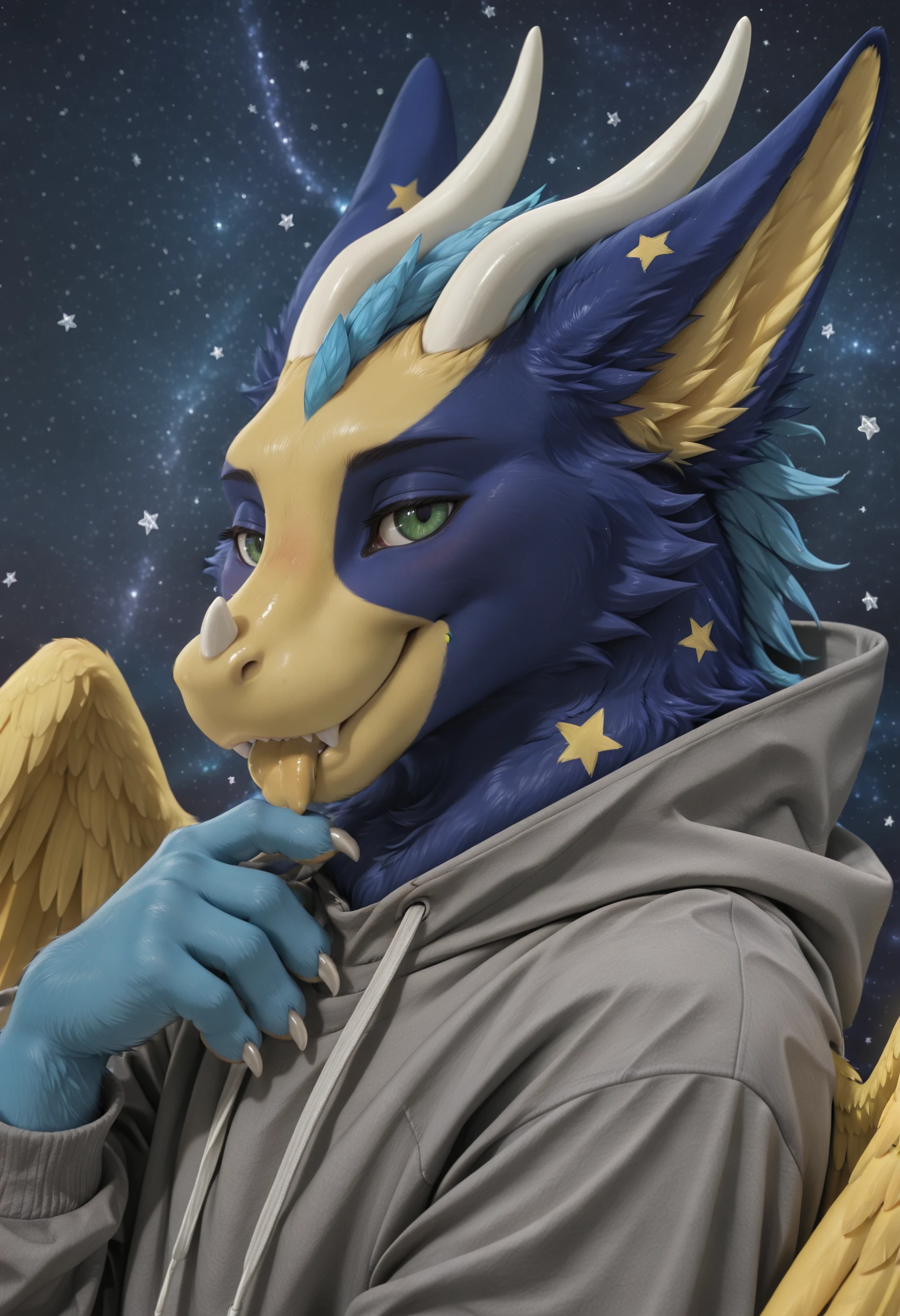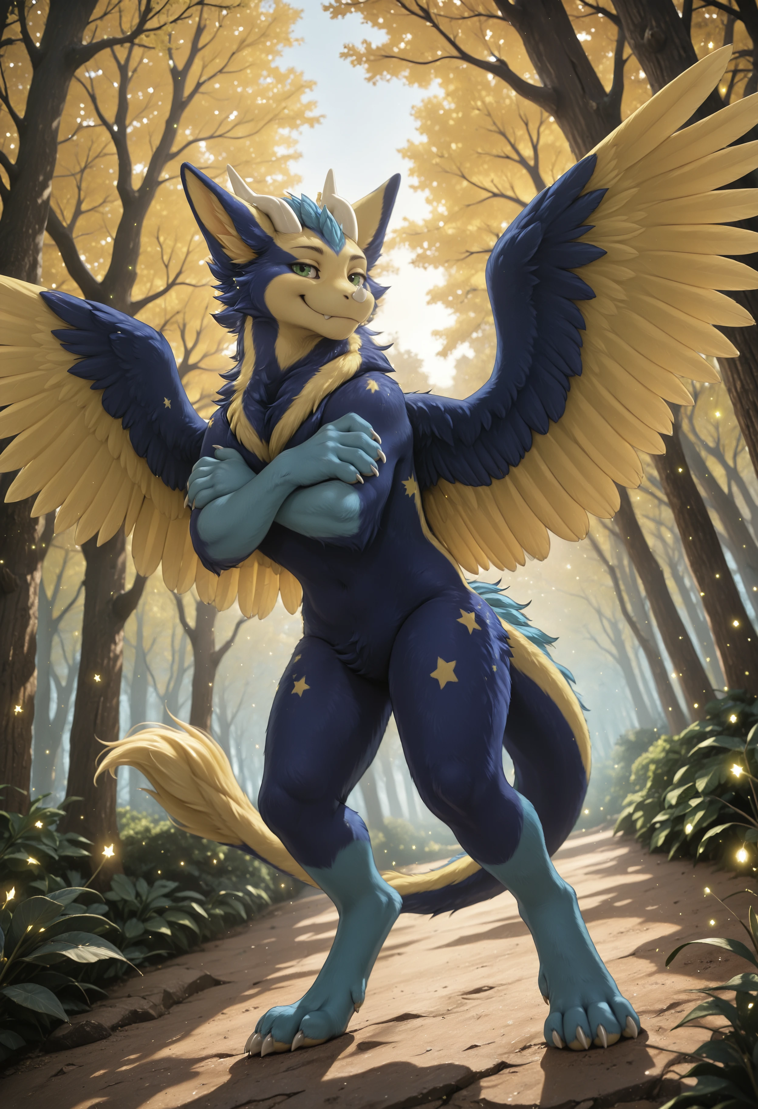 dust4r_0c, dragon, angel dragon, solo, blue body, yellow body, star (symbol), no humans, wings, feathers, green eyes, furry, blue fur, fur, feral, feathered wings, tail, claws, horns, looking at viewer, furred dragon