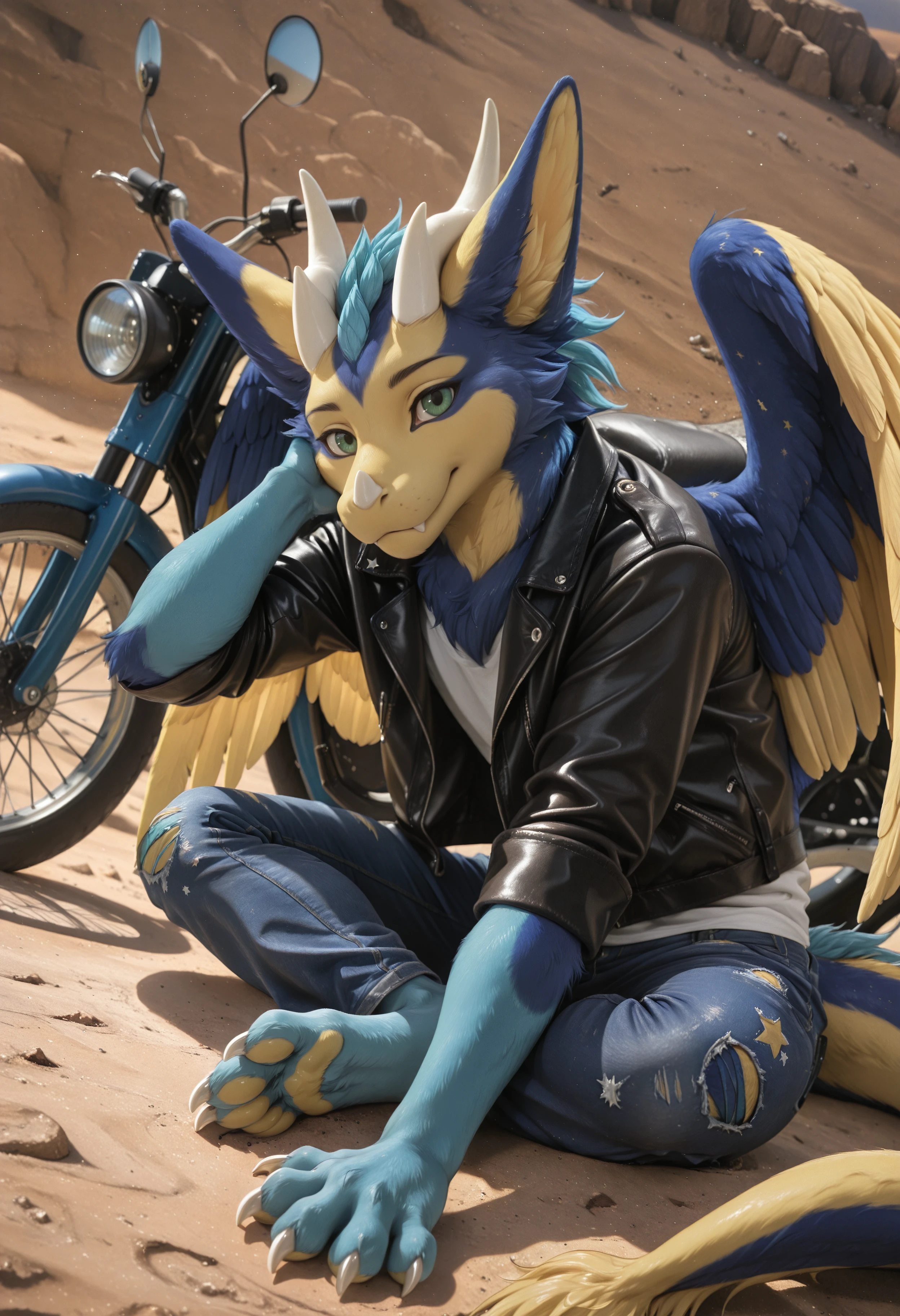 📝 Дастар — ангельский дракон с ярким сине-жёлтым окрасом шерсти, зелёными глазами, белыми изогнутыми рогами и бирюзовыми перьевидными пластинами на голове и шее. Его тело украшено звёздчатыми жёлтыми отметинами, крылья — перьевые, в той же цветовой гамме, а хвост длинный и пушистый с жёлтым кончиком.