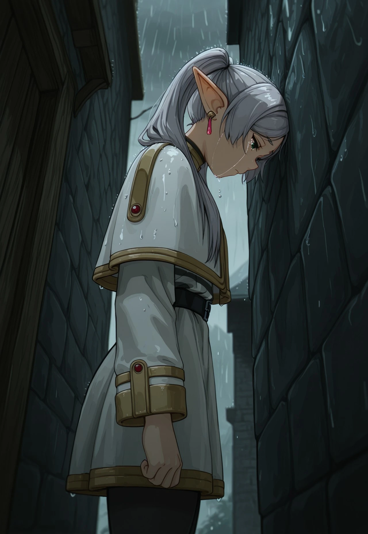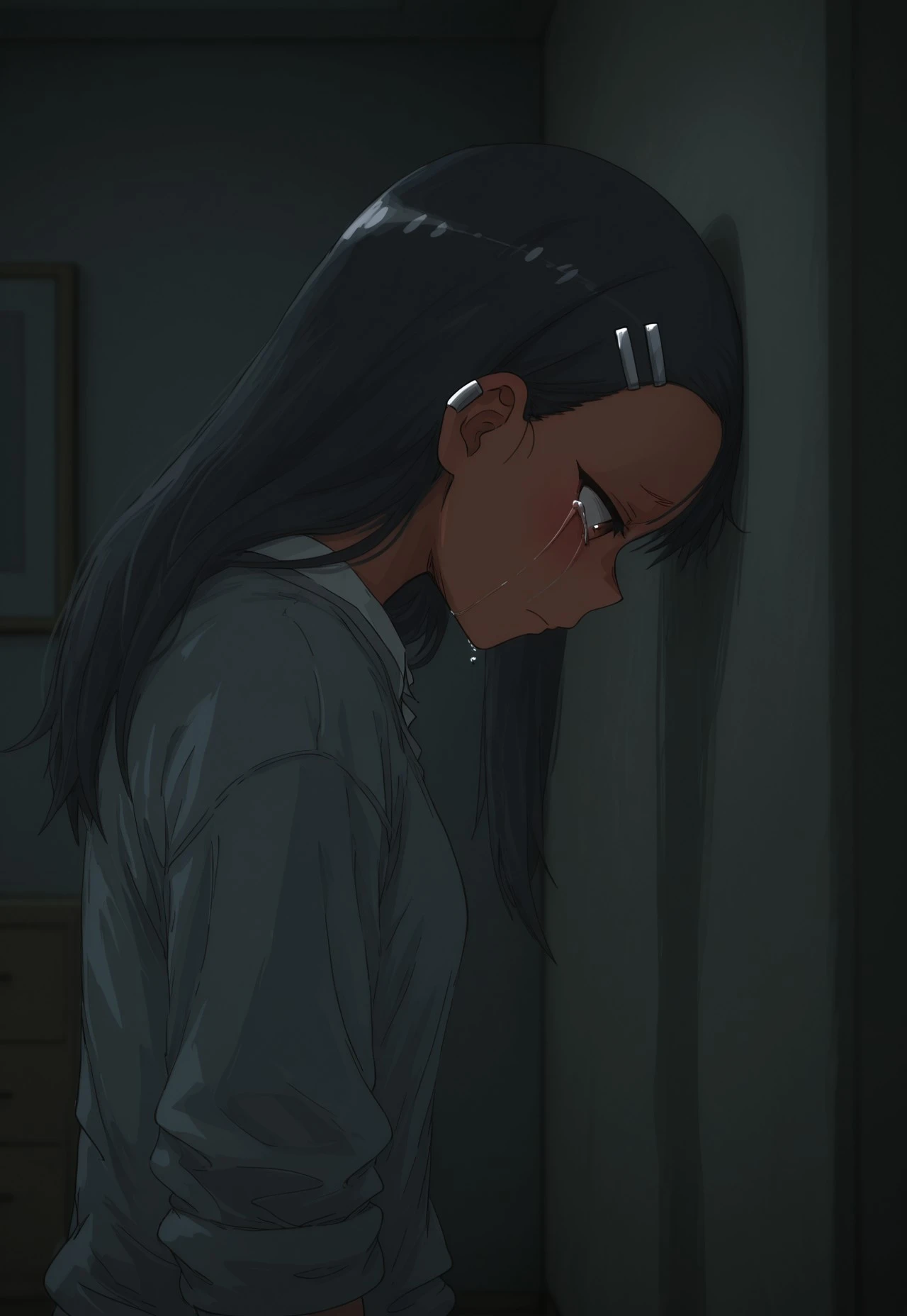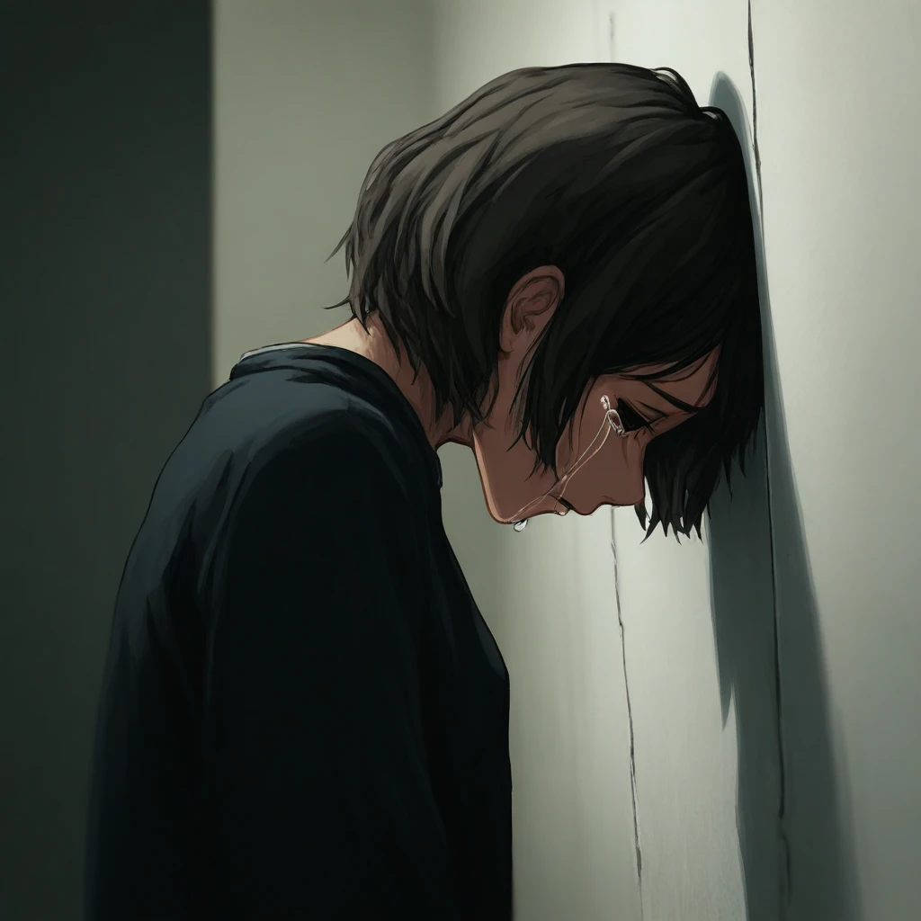 Sormb2, head to wall, crying, tears, looking down, from side,