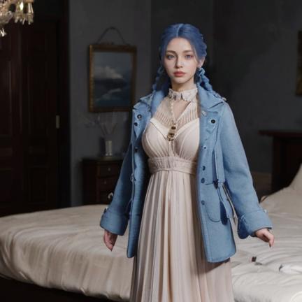 2. Tag is Sophia, to help: 1girl, solo, long hair, blue eyes, dress, jewelry, blue hair, jacket, braid, earrings, necklace, twin braids, lips, blue jacket,
