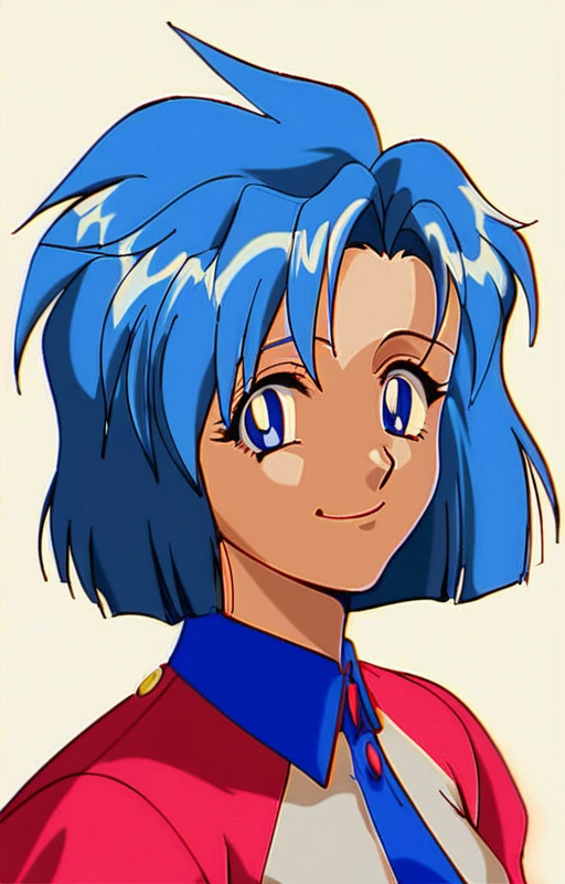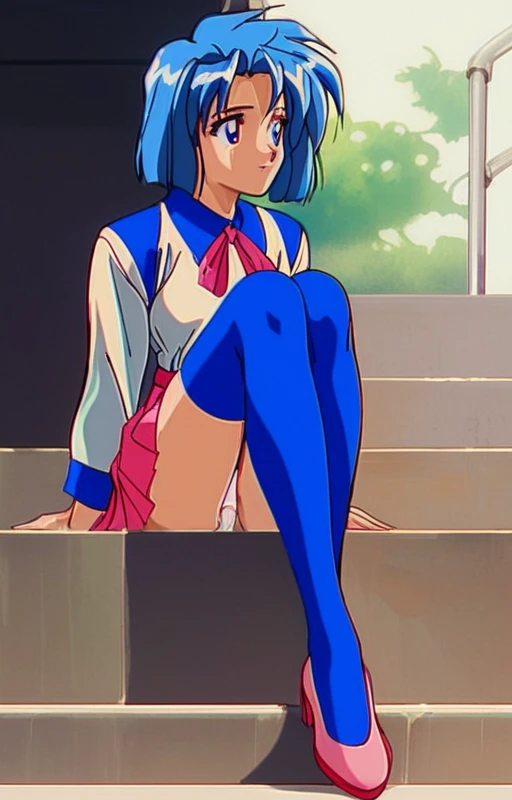 harukaaod2, 1girl, solo, blue hair, short hair, retro artstyle, 1990s (style), blue eyes, thighhighs, shirt, pleated skirt,