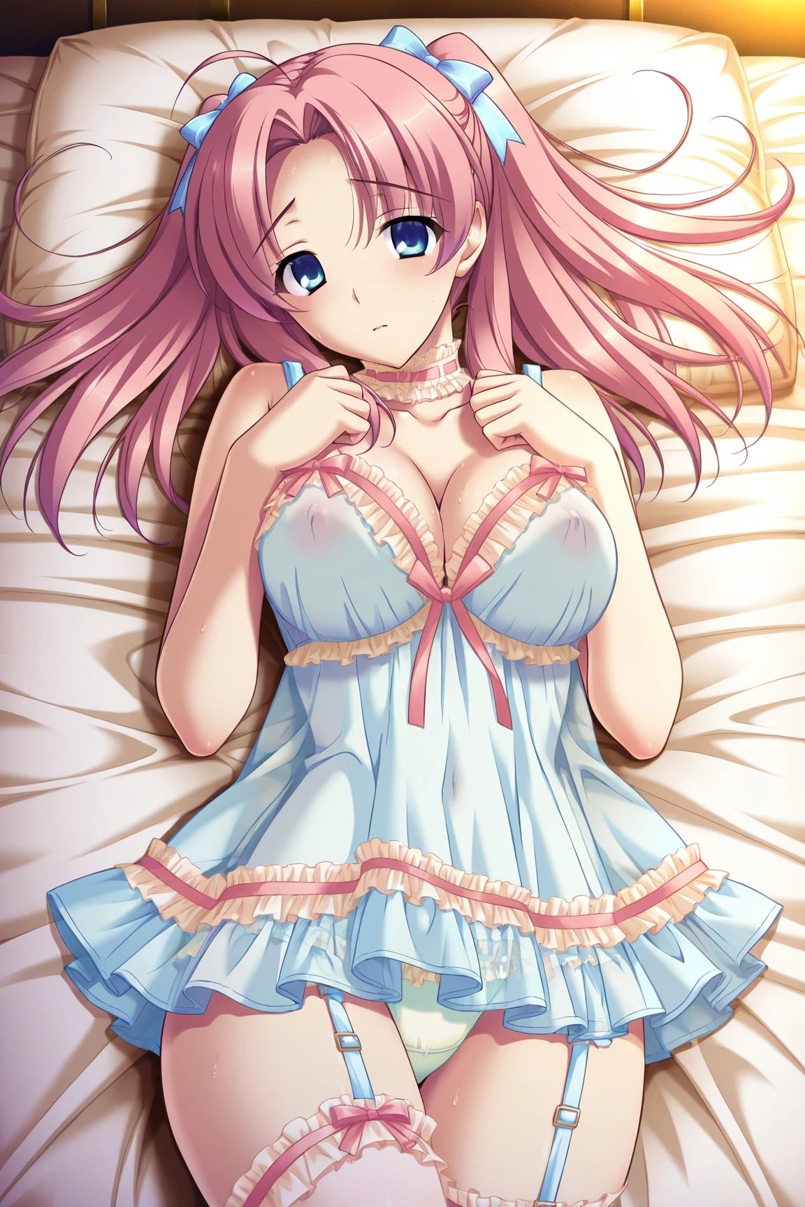 Lingerie : frilled choker,ribbons,negligee,frilled microskirt,straps,laced stockings,panties,(bow sandals)