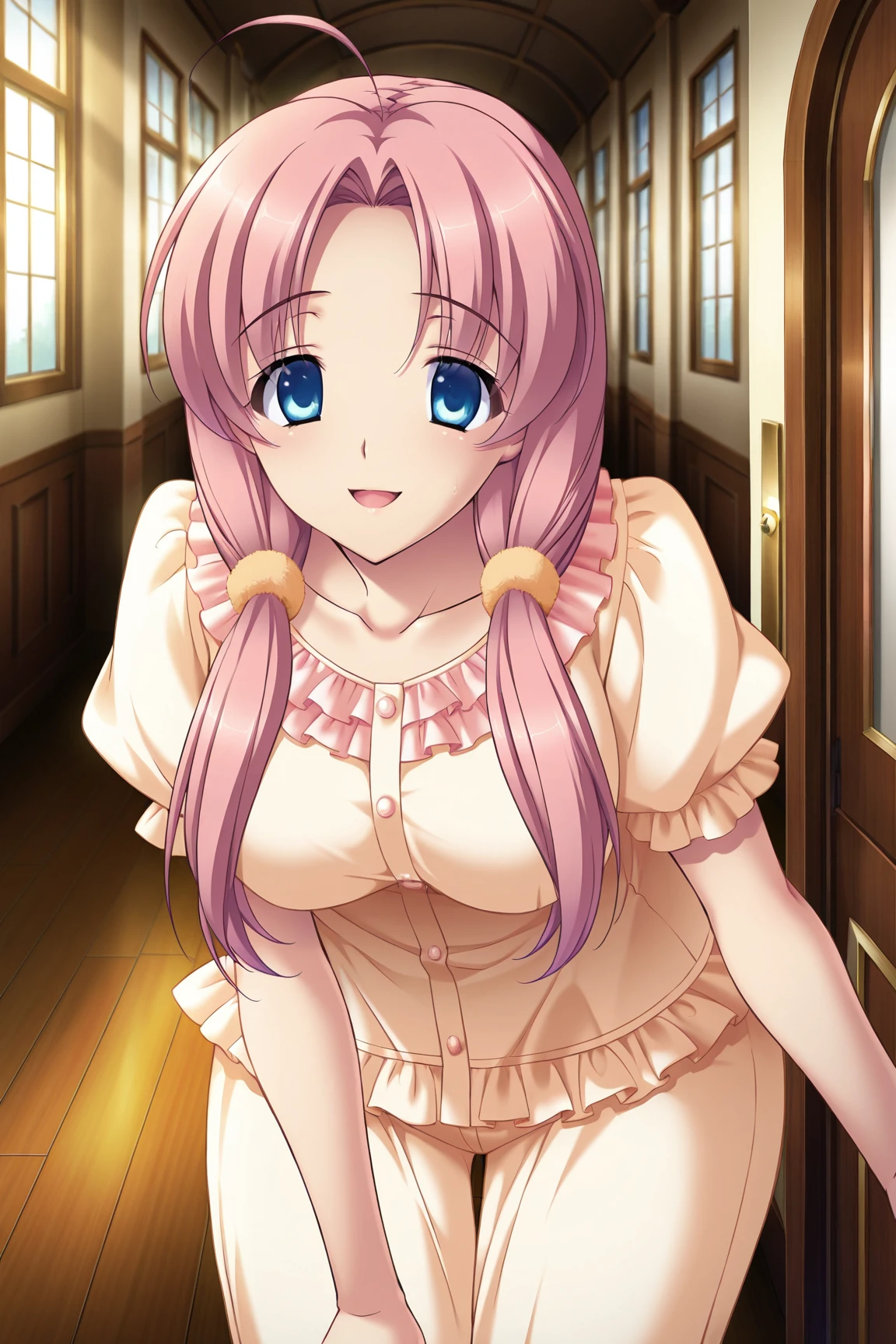 Sleepwear : pink hair,twin pigtails,ahoge,blue eyes,low hairties,long hair,short sleeves,puffed sleeves,frilled pajamas,short,(slippers)