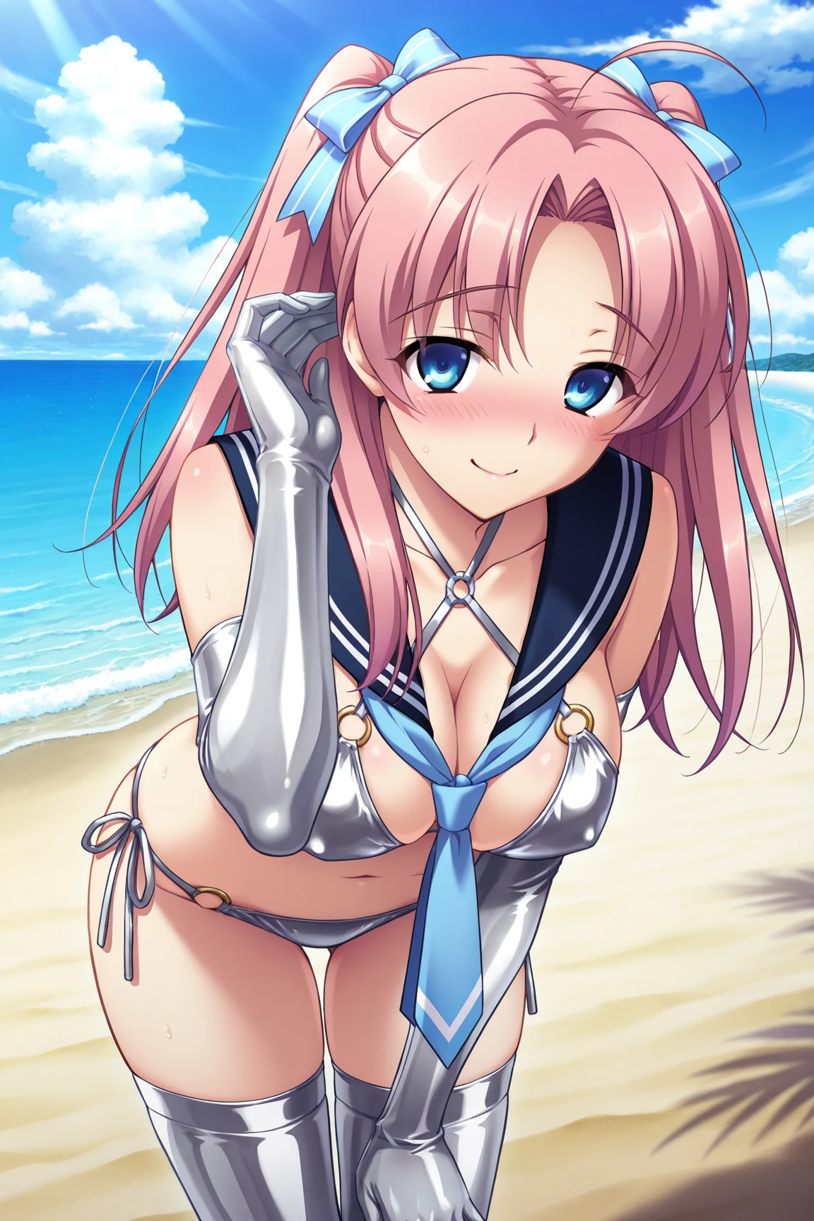 Appearence : pink hair,twintails,ahoge,blue eyes, hair bow,parted bangs,long hair