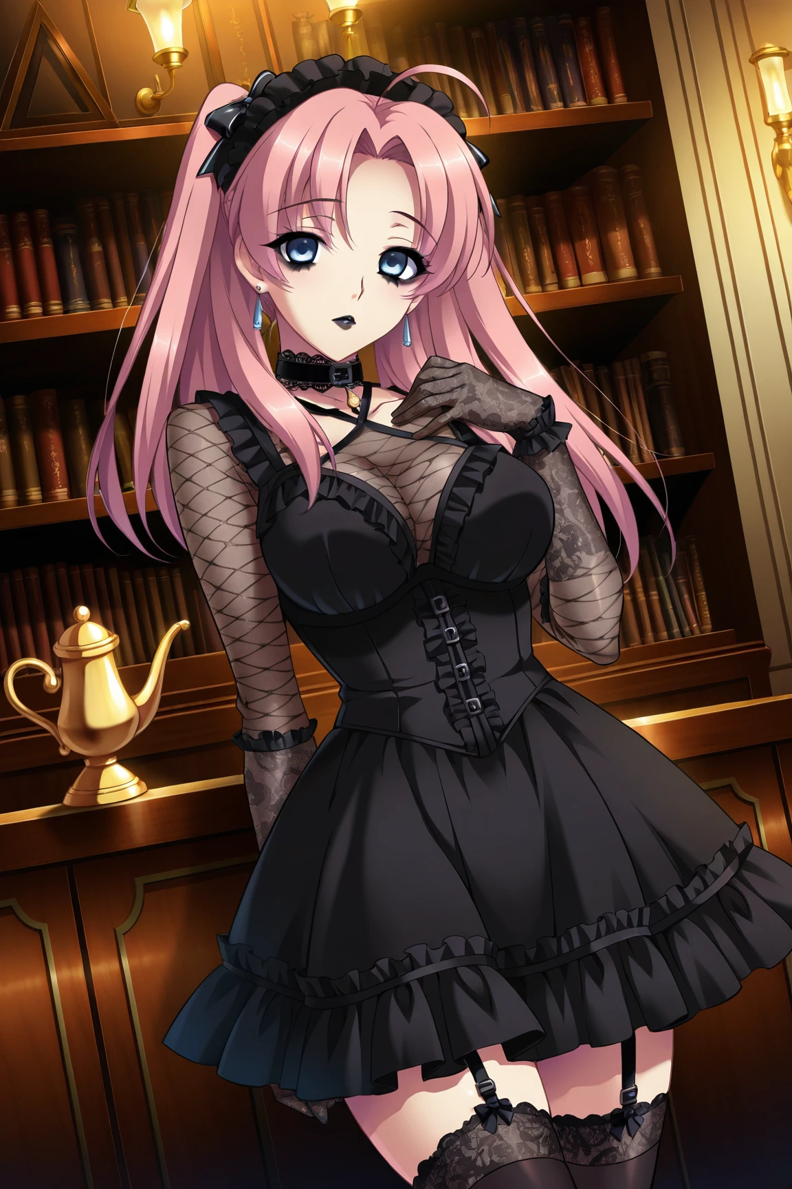 Latex : latex frilled collar,frilled straps,frilled bra,underboobs,nipples,frilled latex arm sleeves,white miniskirt,latex panties,garter straps,frilled stockings,(latex heels boots,laced boots).