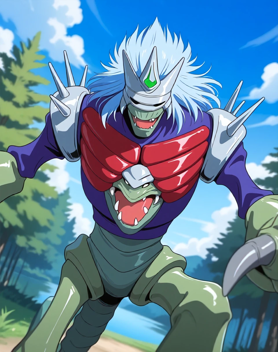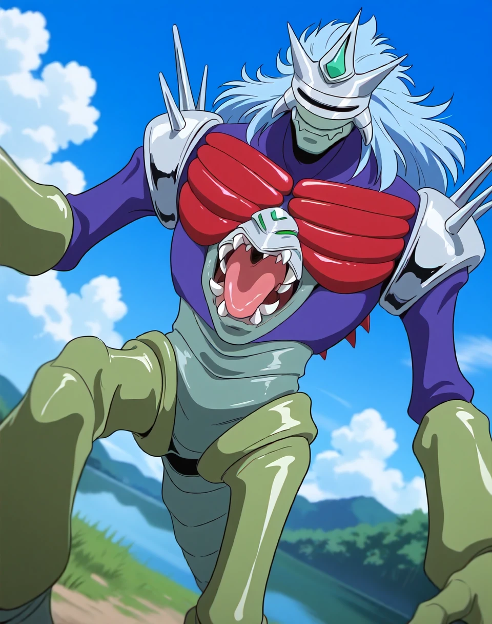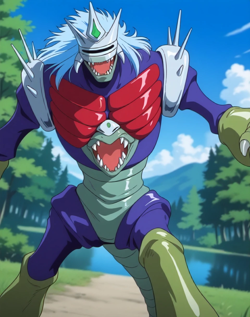 Sometimes adding prompts like ( wide upper body, red chest, teeth, ) can help with making pictures in some cases.