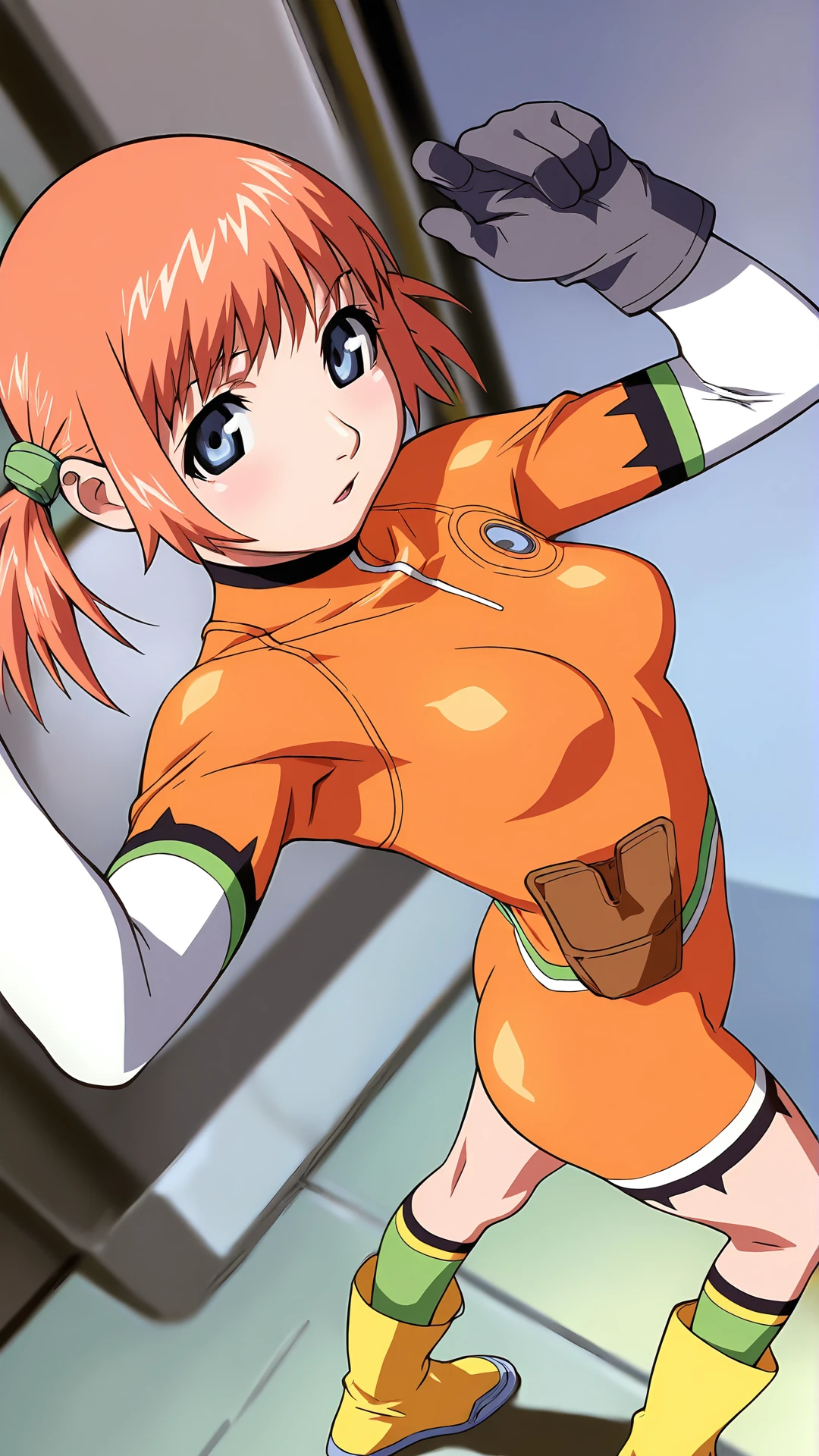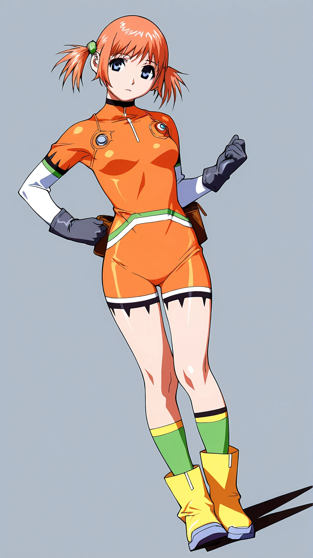 Mikura Suzuki v2,1girl,solo,twintails,gloves,boots,blue eyes,short hair,hair ornament,short twintails,socks,orange hair,,