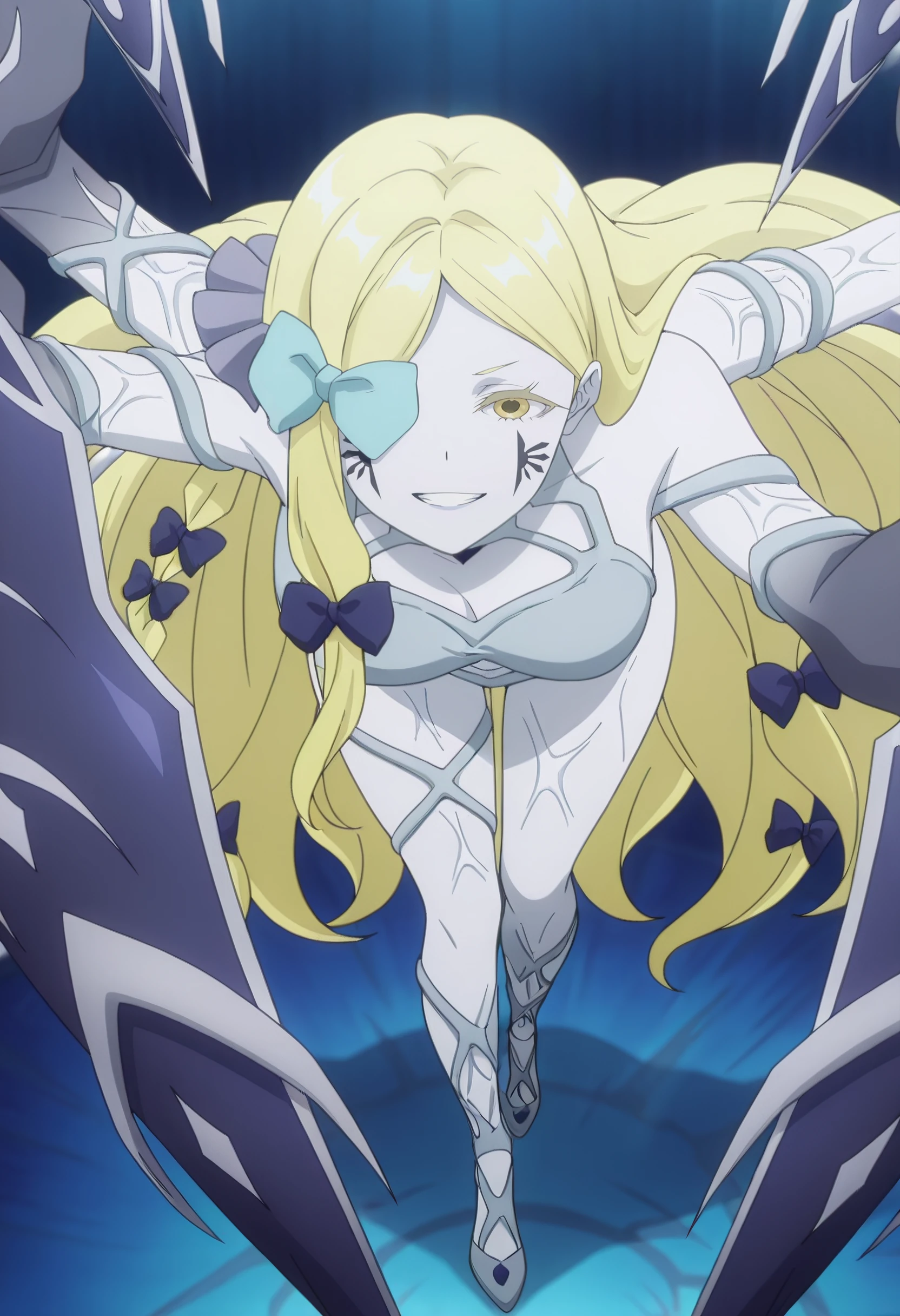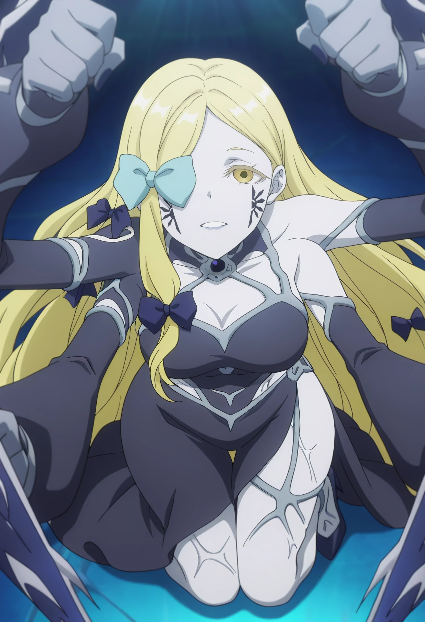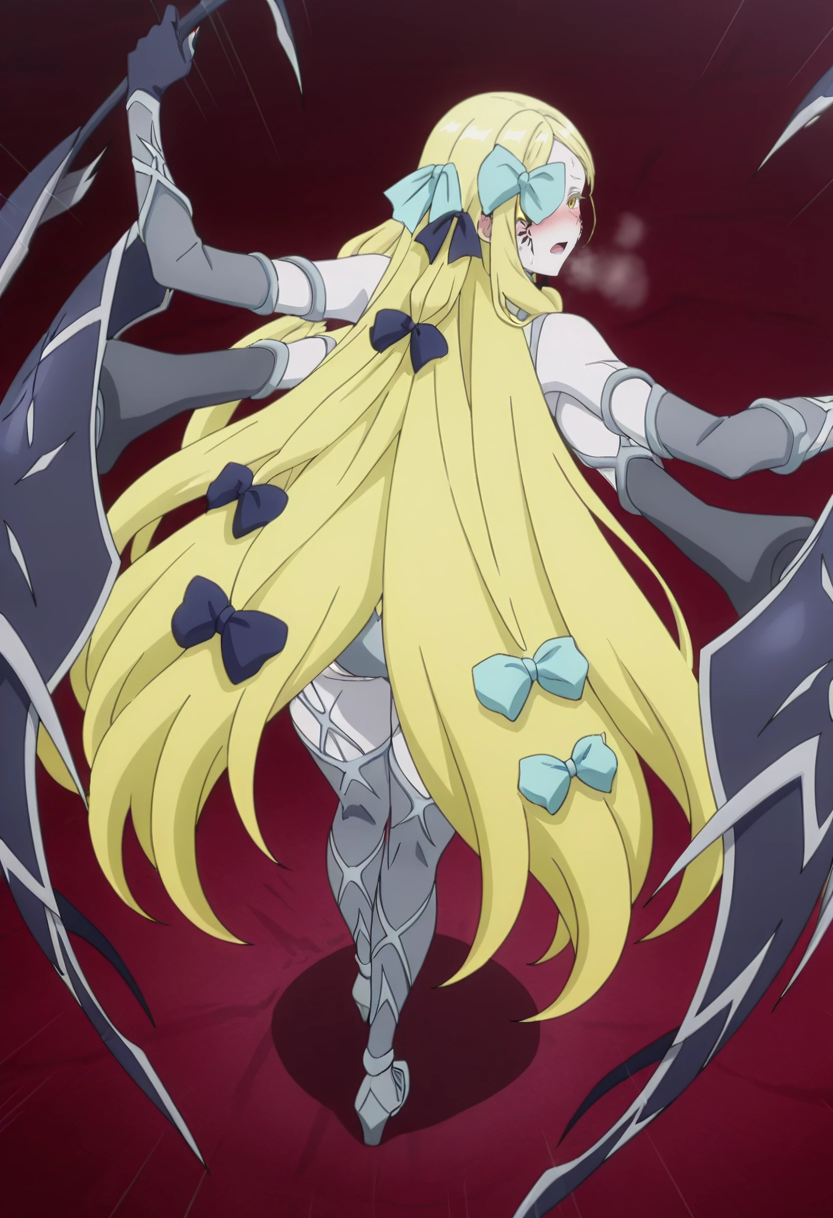 GirVilfina, blonde hair, absurdly long hair, facial mark, yellow eyes, very long hair, hair over one eye, bow, hair bow, blue bow, joints, ultra beast, multiple hair bows, extra arms, extra hands, 4 arms,