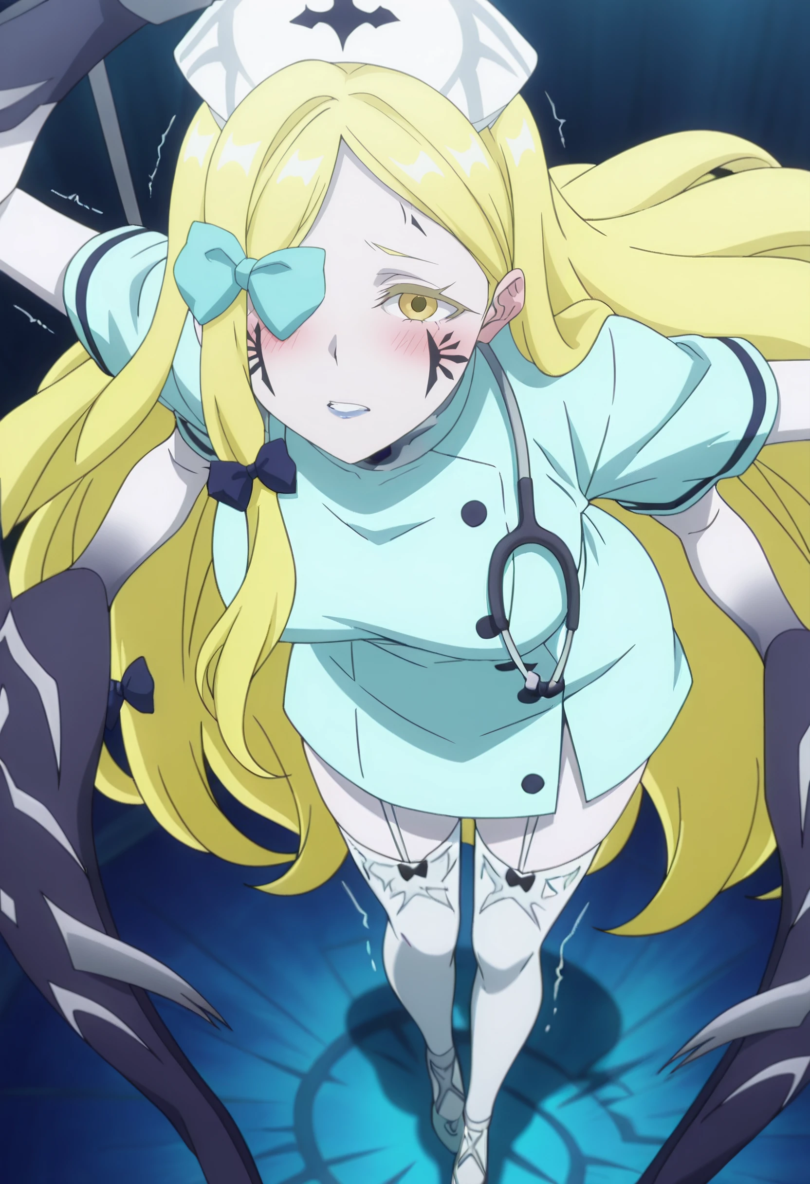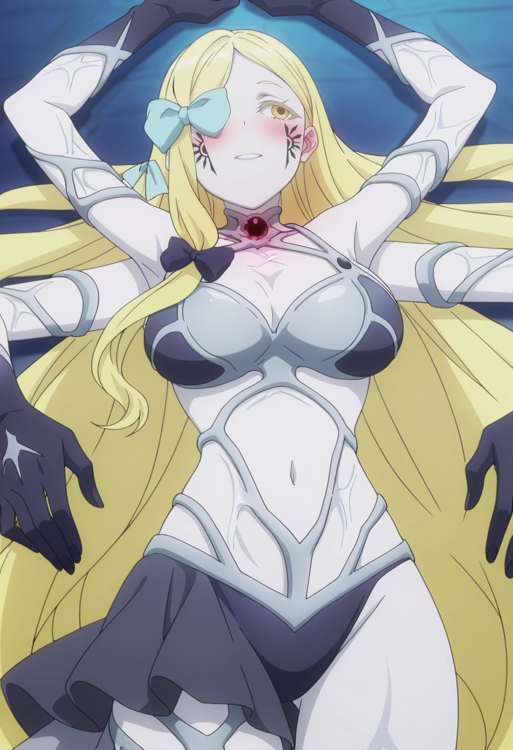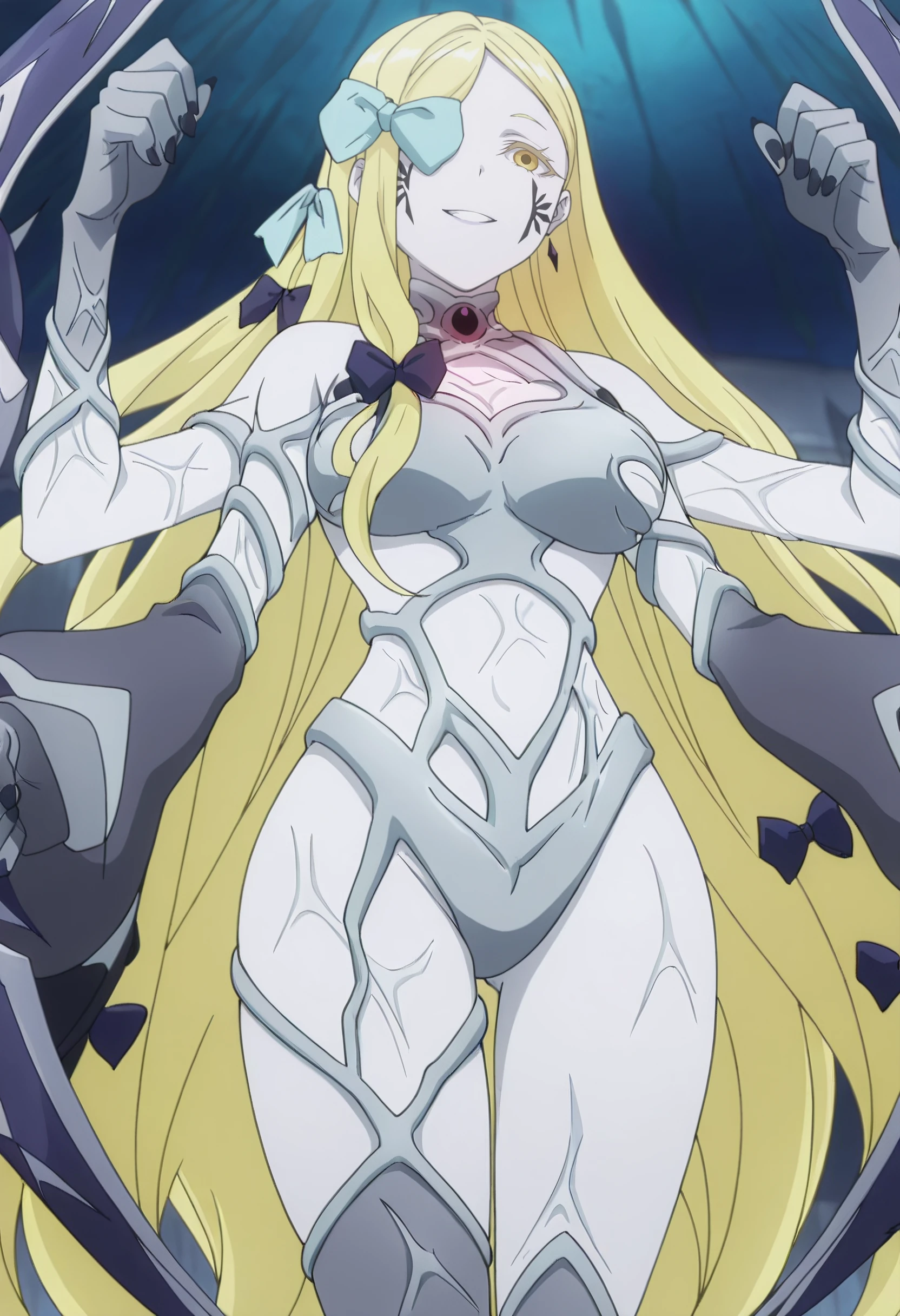 GirVilfina, blonde hair, absurdly long hair, facial mark, yellow eyes, very long hair, hair over one eye, bow, hair bow, blue bow, joints, ultra beast, multiple hair bows, extra arms, extra hands, 4 arms,