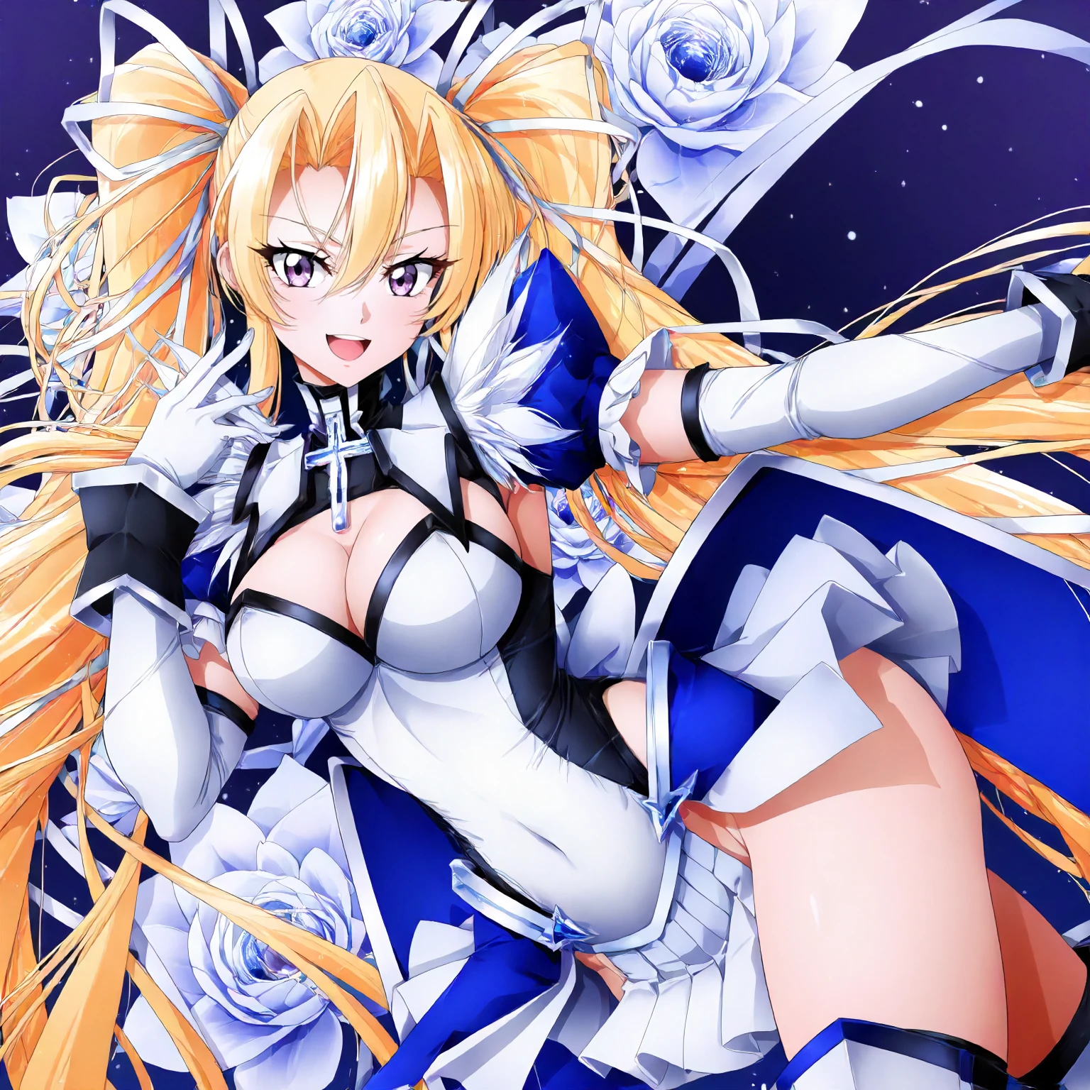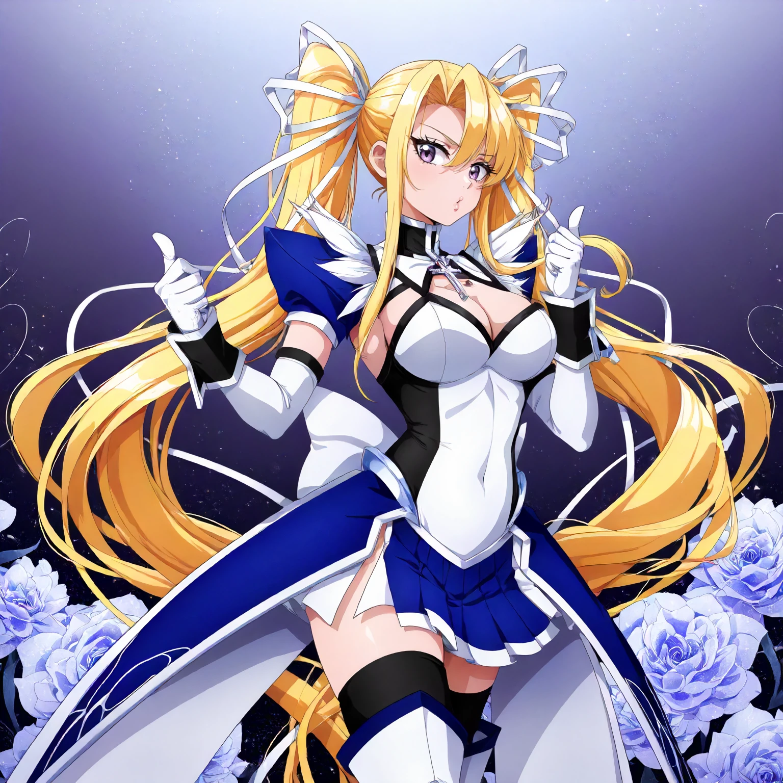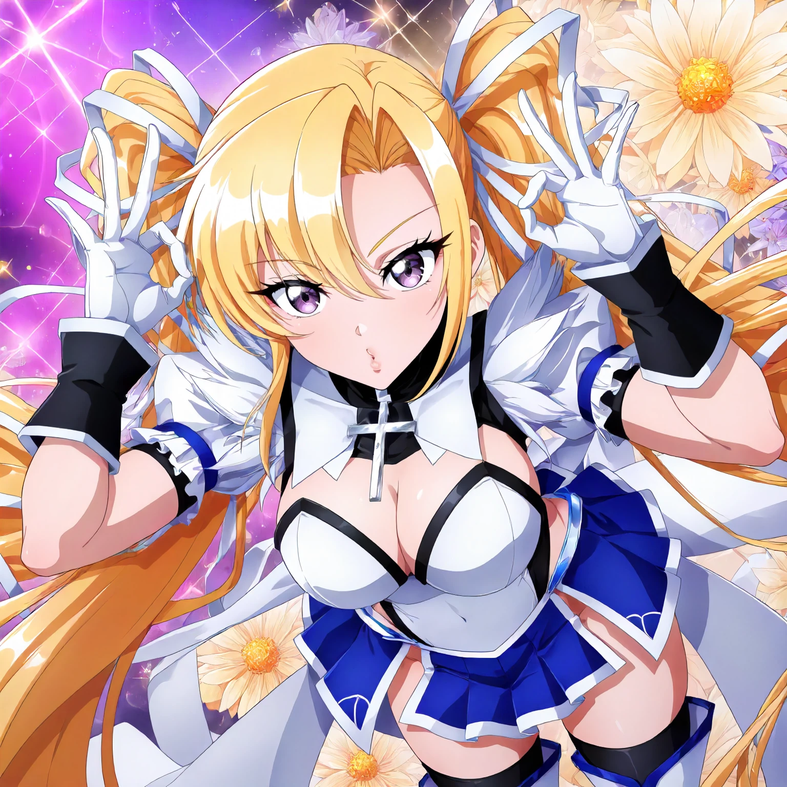 black turtleneck,cross pendant,white shirt,leotard,shoulder fur,blue puff_sleeves,cleavage,short_sleeves, detached sleeve,black cuffs,white gloves, white mini skirt,side slit skirt,waist pleated_skirt,blue skirt, black_thighhighs,