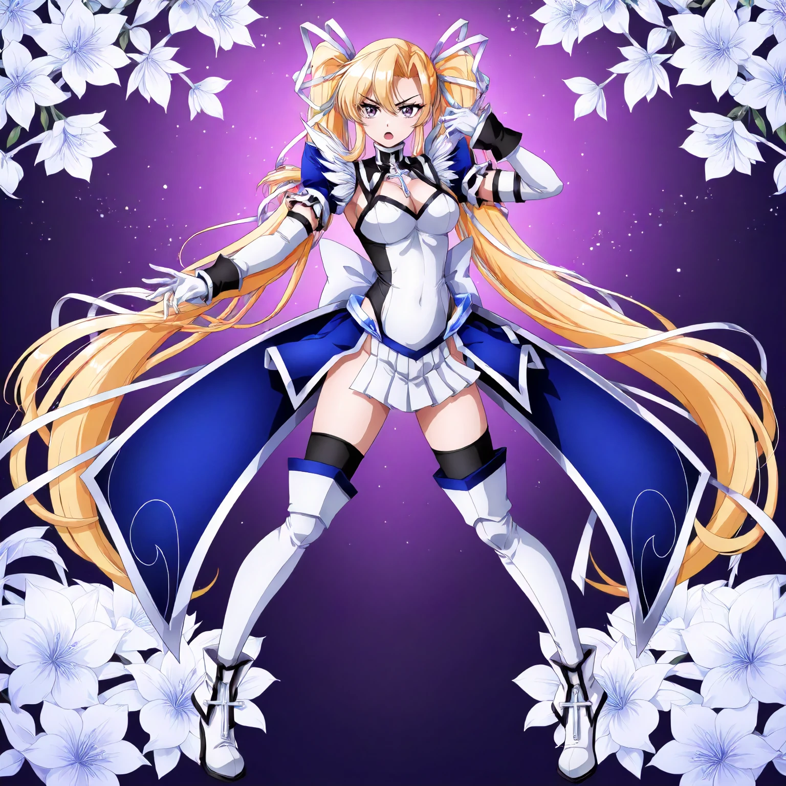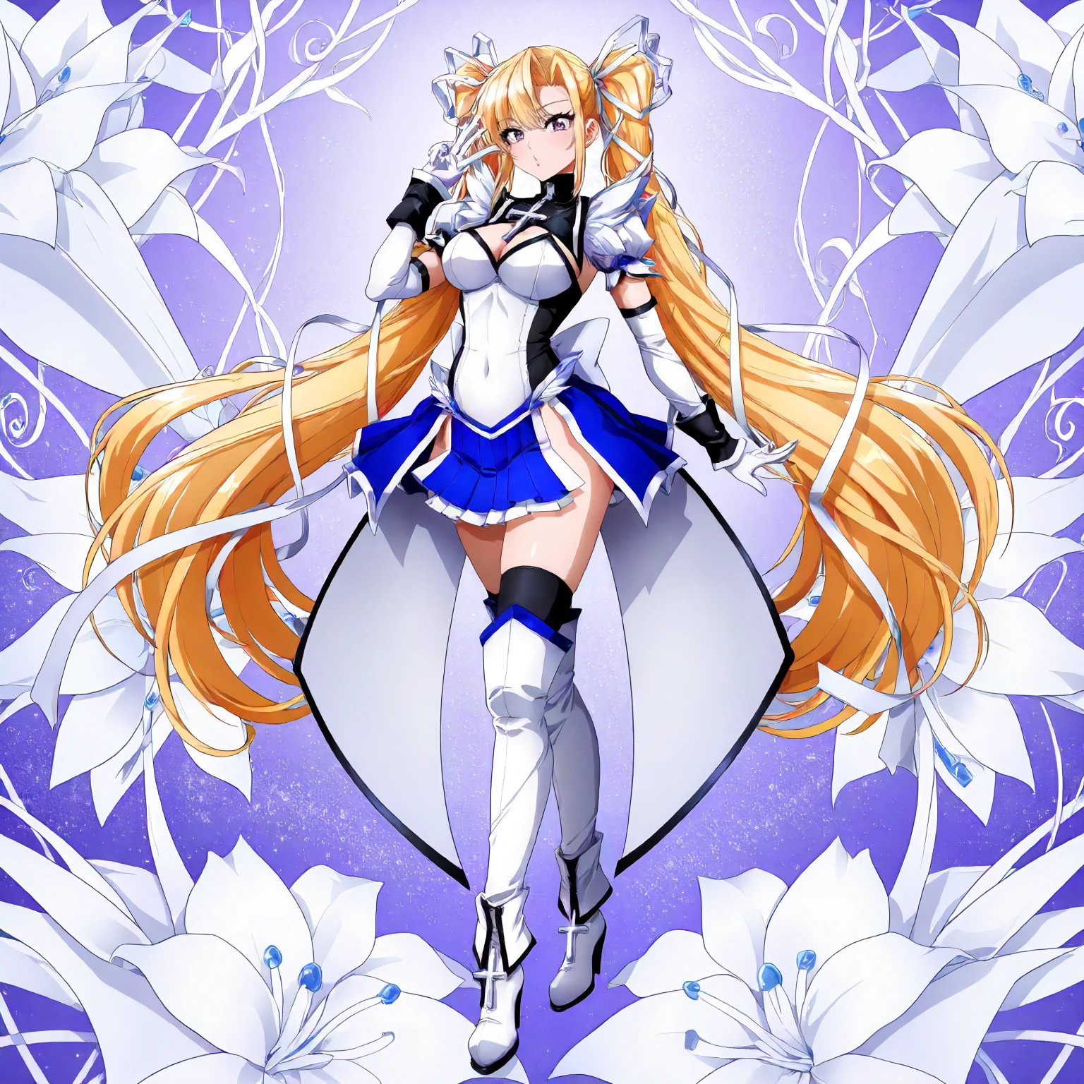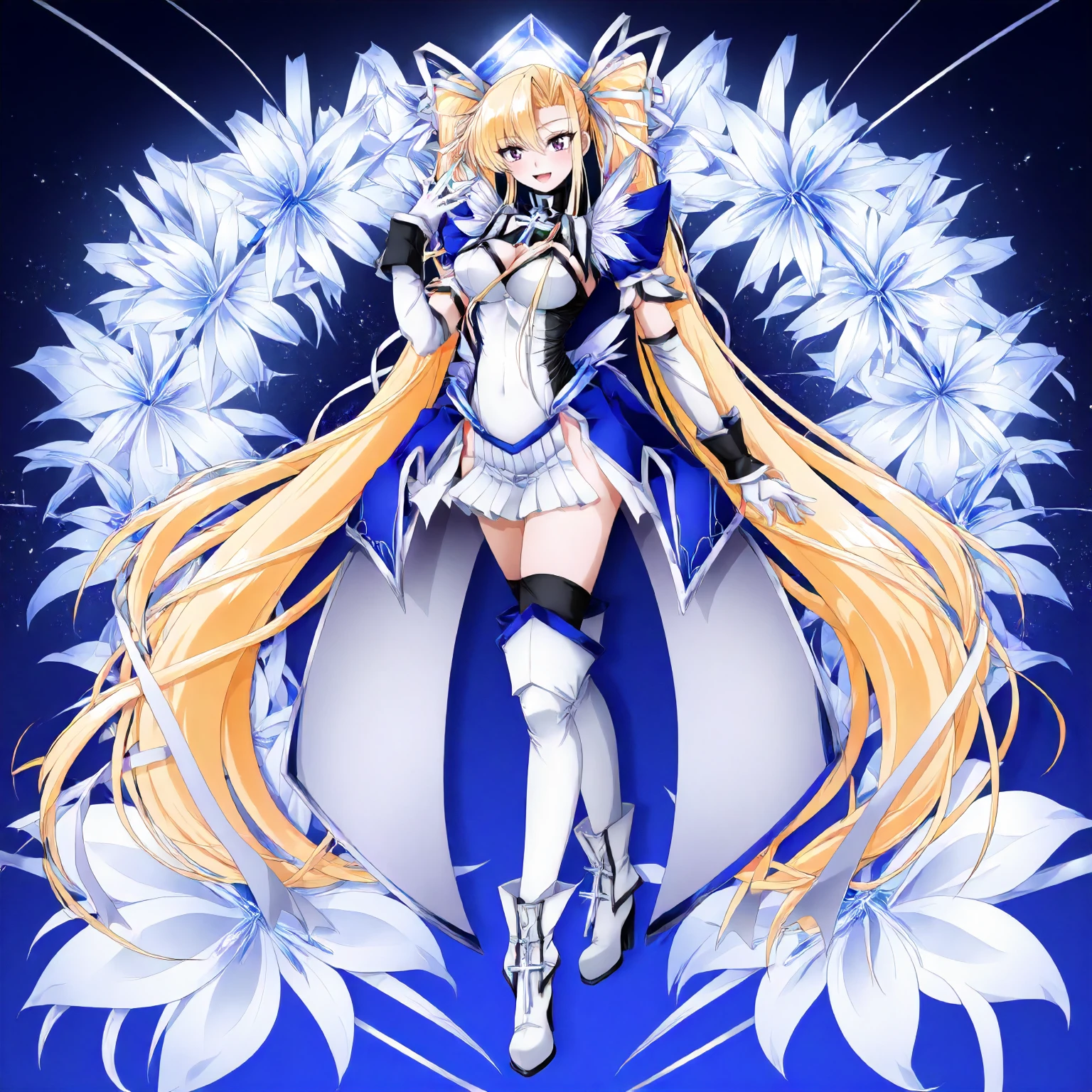 black turtleneck,cross pendant,white shirt,leotard,shoulder fur,blue puff_sleeves,cleavage,short_sleeves, detached sleeve,black cuffs,white gloves, white mini skirt,side slit skirt,waist pleated_skirt,blue skirt, black_thighhighs,