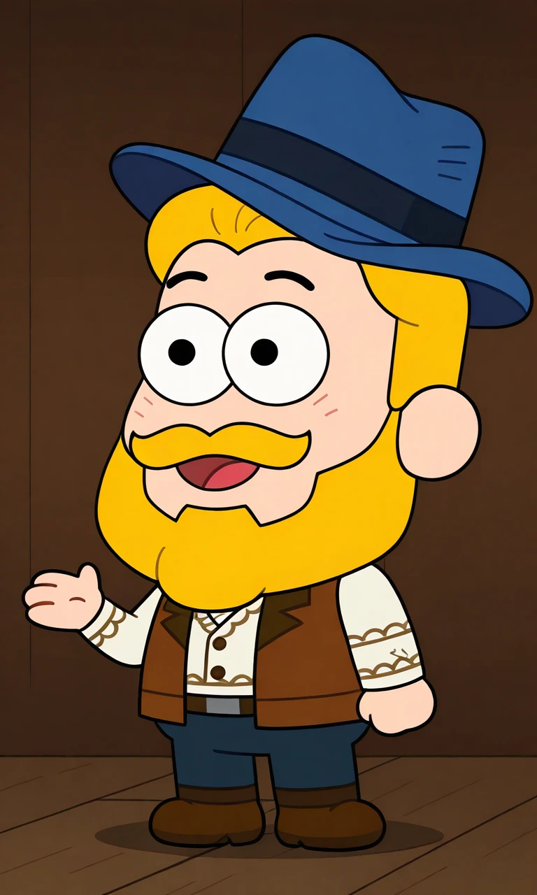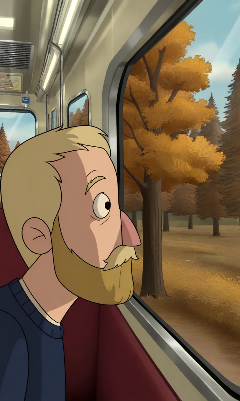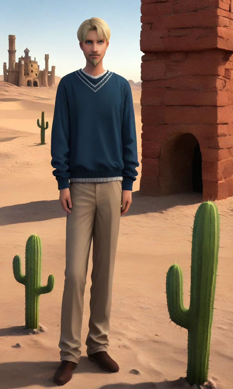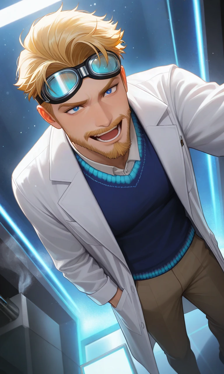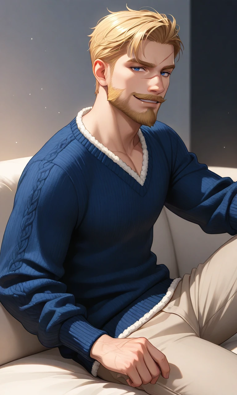 1boy,blonde hair,short hair,beard,moustache,blue eyes,blue sweater,white-trimmed sweater,pants