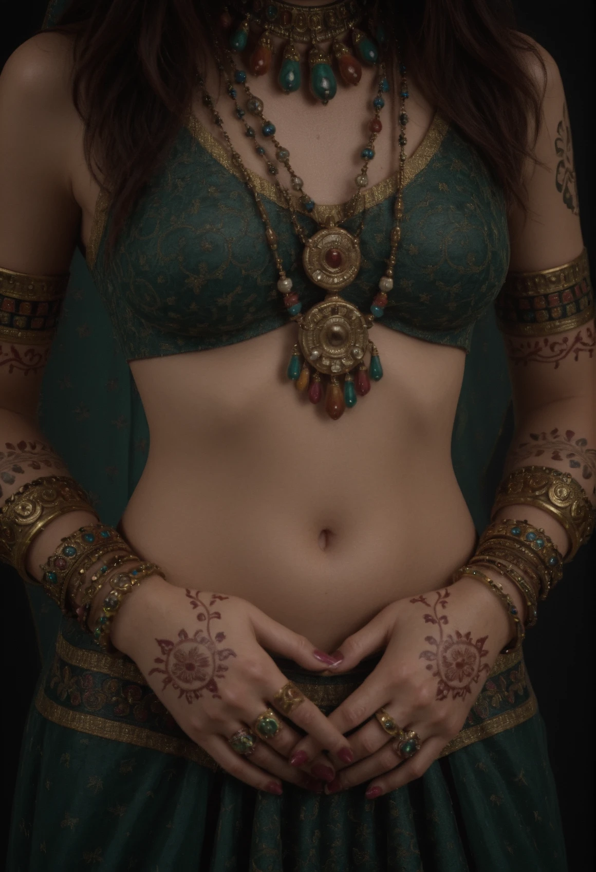 bare midriff, smooth skin, intricate red henna on hands and forearms, stacked gold and gemstone bangles, large ornate rings, embroidered waistband with gold trim, flowing green and purple fabric, hyperrealistic, unreal engine render, 1girl, solo, jewelry, ring, navel, bracelet, necklace, head out of frame, tattoo, gemIndian Woman Royal | Facial Shot [2]