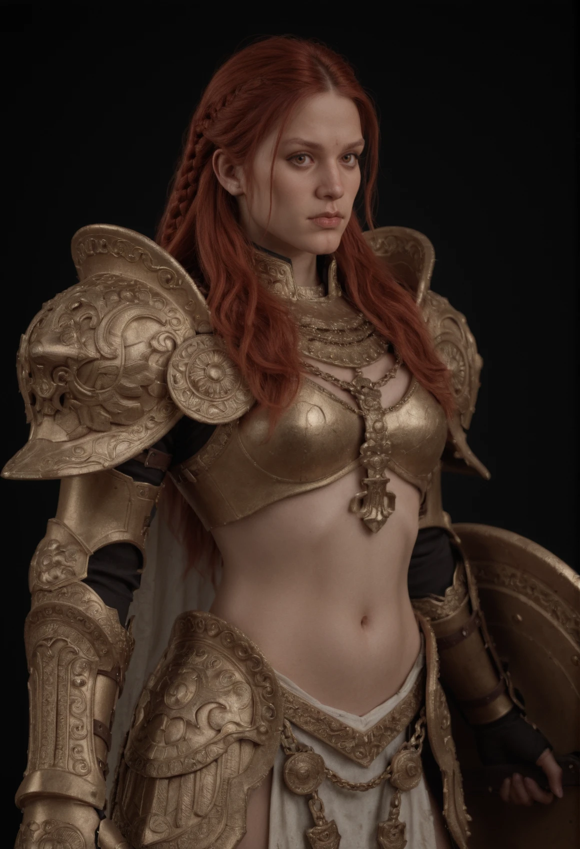 shieldmaiden_gold, red braided hair, brown eyes, defined eyebrows, pale skin, serious expression, hyperrealistic, 1girl, solo, armor, navel, long hair, midriff, braid, red hair, shield, looking at viewer, gauntlets, shoulder armorshieldmaiden_gold, red braided hair, brown eyes, defined eyebrows, pale skin, serious expression, hyperrealistic, 1girl, solo, red hair, armor, helmet, long hair, braid, red eyes, portrait, simple background, black background, winged helmet, looking to the sideShieldmaiden Gold | Dynamic Shots [4]