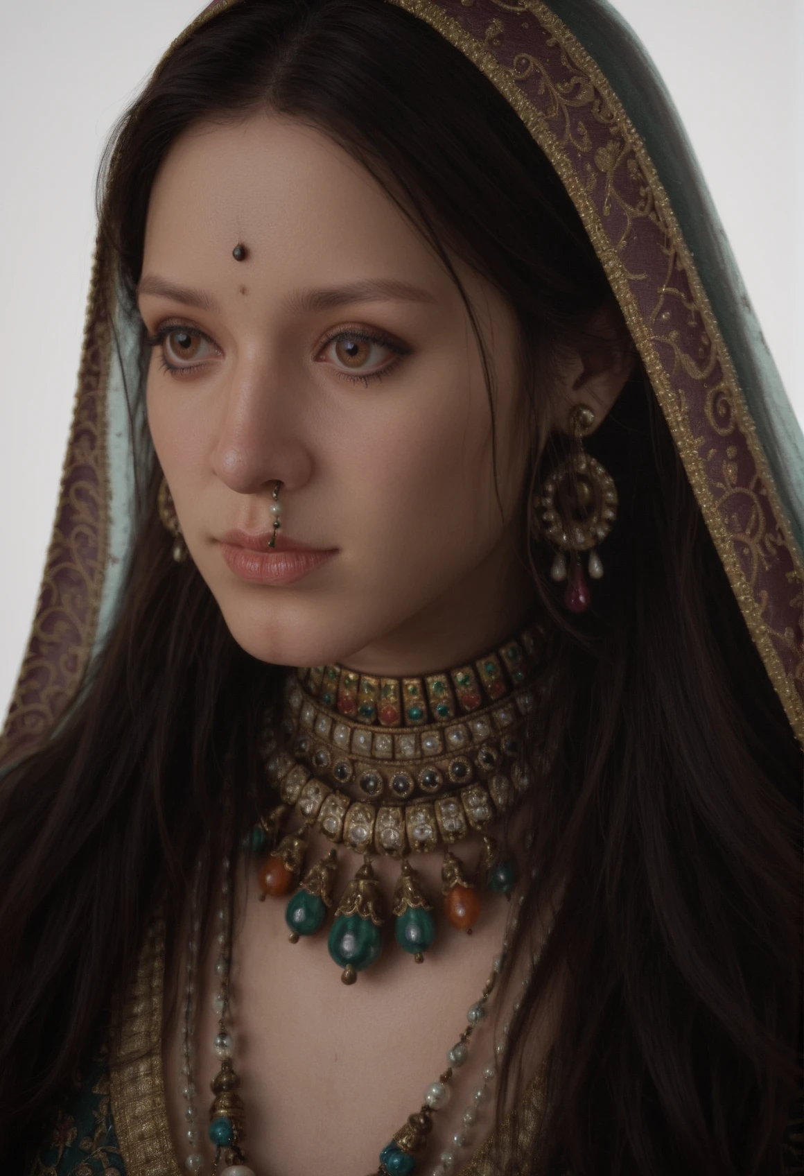 indian_woman_royal, maang tikka, nose ring, pearl nose chain, heavy gold necklace, jhumka earrings, embroidered dupatta, gold embroidery, deep purple and emerald green, draped fabric, long black hair, dark brown eyes, smoky eye makeup, defined eyebrows, smooth skin, serene expression, hyperrealistic, 1girl, solo, jewelry, brown eyes, realistic, earrings, brown hair, long hair, necklace, portrait, veil, makeup, simple background, closed mouthIndian Woman Royal | Upper Body Shot [2]