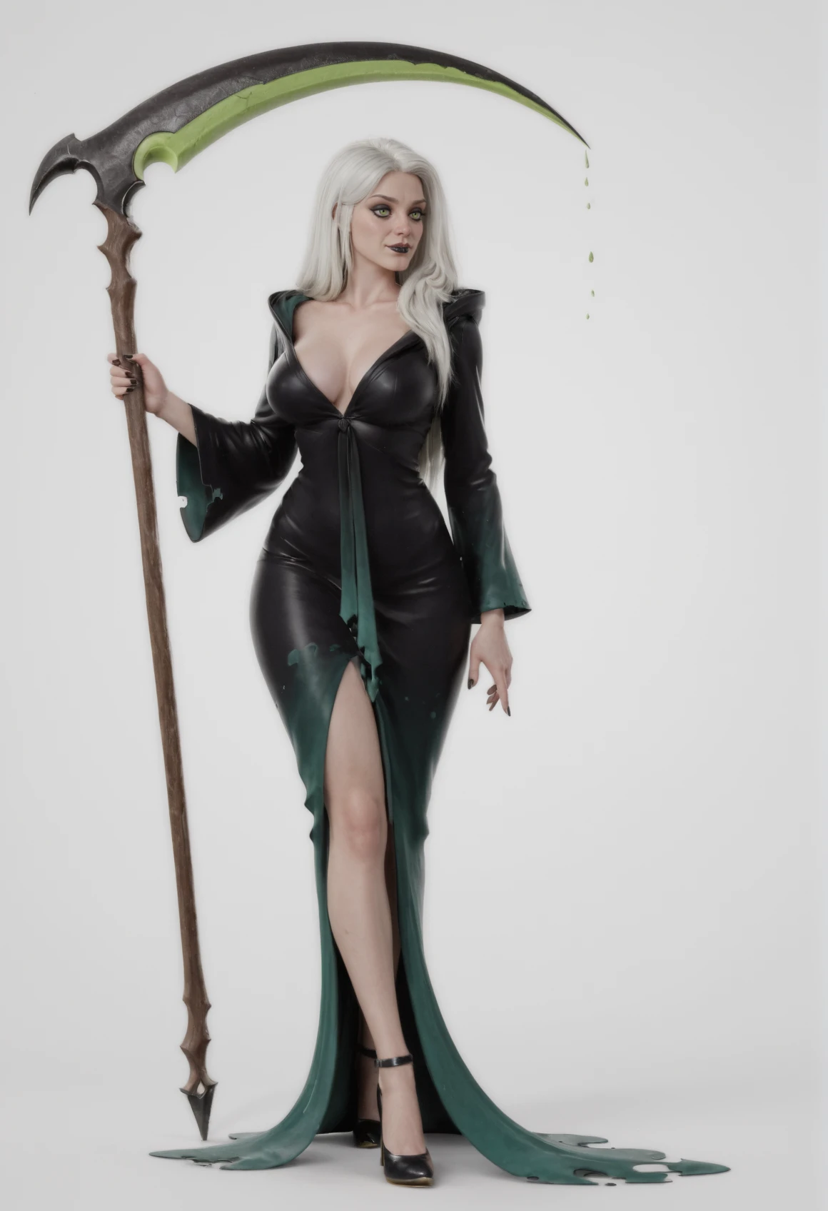 lady death, black robe, green lining, long white hair, voluminous white hair, wavy white hair, sleek white hair, high volume hair, glowing green eyes, heavy black eyeliner, sharp black eyebrows, smirking mouth, dark lipstick, pale skin, angular jawline, stylized 3d cartoon, 1girl, solo, green eyes, long hair, smile, makeup, white hair, collarbone, grey background, simple background, half-closed eyes, eyeshadow, closed mouth, black lips, smirkLady Death Companion [1]