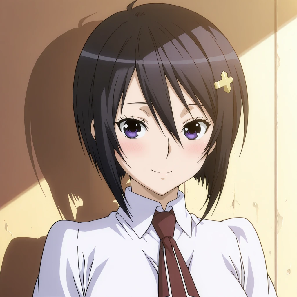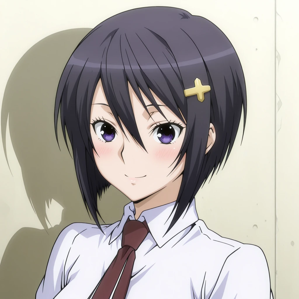 sahashi_yukari_sekirei, 1girl, anime coloring, short hair, black hair, purple eyes, hair ornament,
