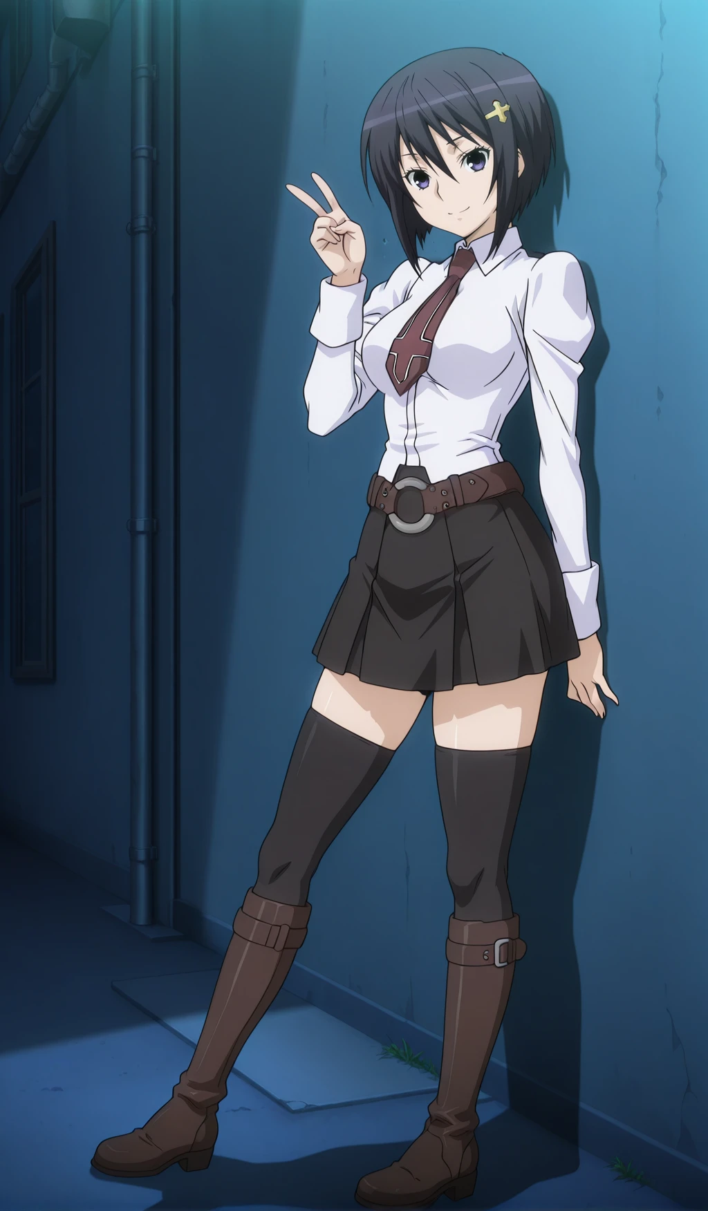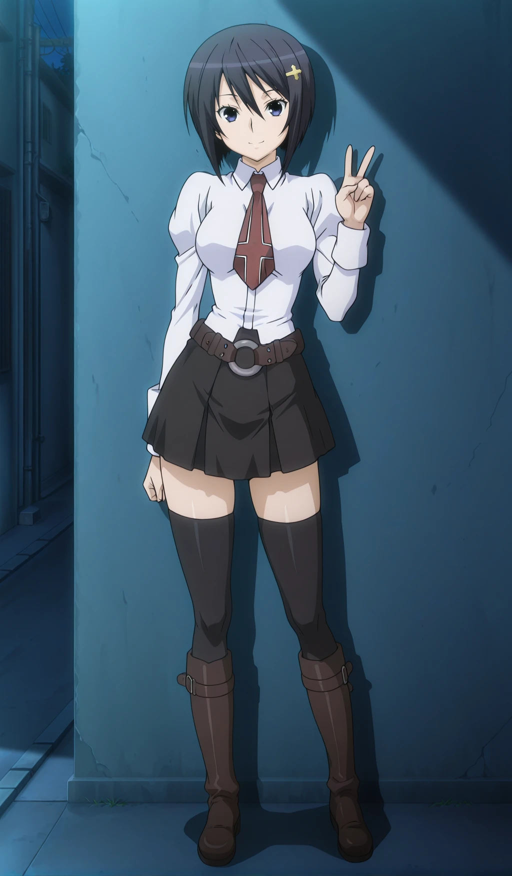school uniform, thighhighs, boots, skirt, zettai ryouiki, necktie, knee boots, belt, long sleeves,
