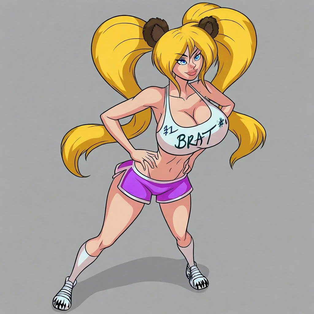 Goldilocks, Human Female, Fake Animal Ears, Bear Ears, Blue Eyes, Twintails, Long Hair, Blonde Hair, Lips, White Crop Top, Midriff, Navel, Purple Dolphin Shorts, White Kneehighs, Sneakers