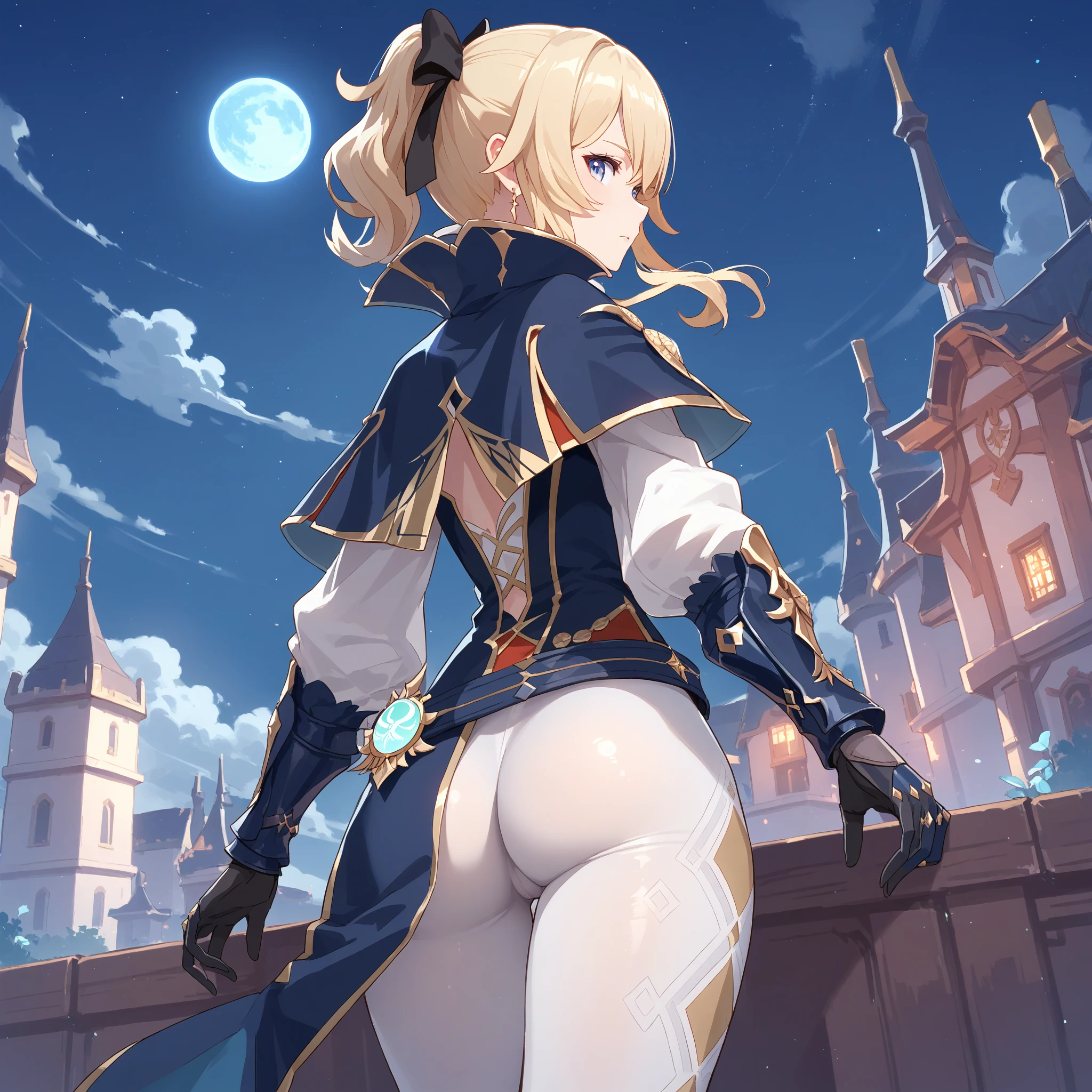 jean \(genshin impact\), jean def, blue eyes, blonde hair,ponytail,black gloves,detached collar,blue capelet, tight pants,