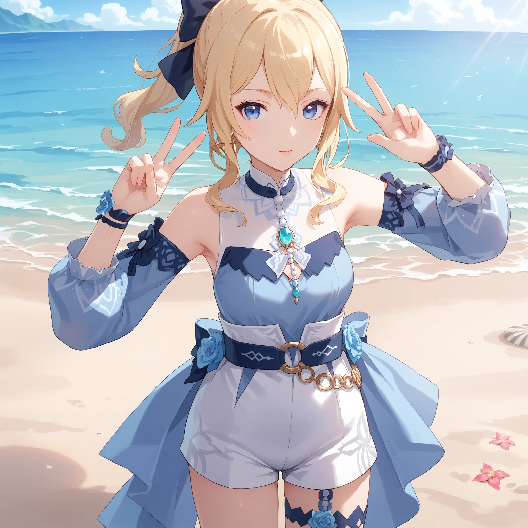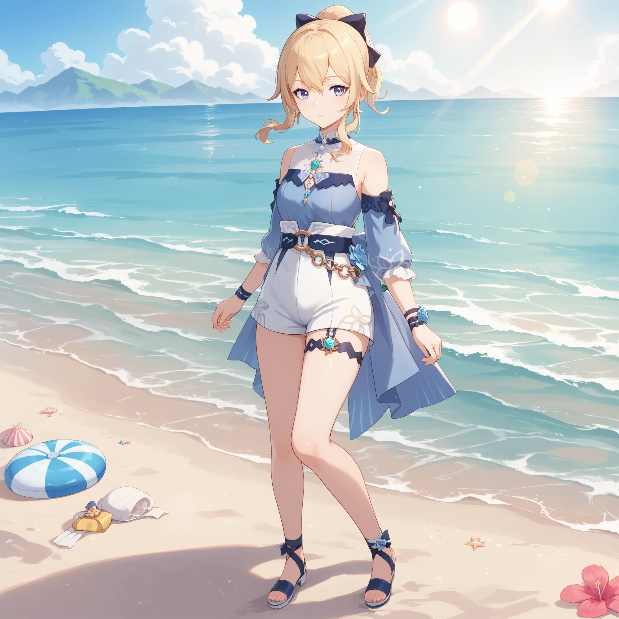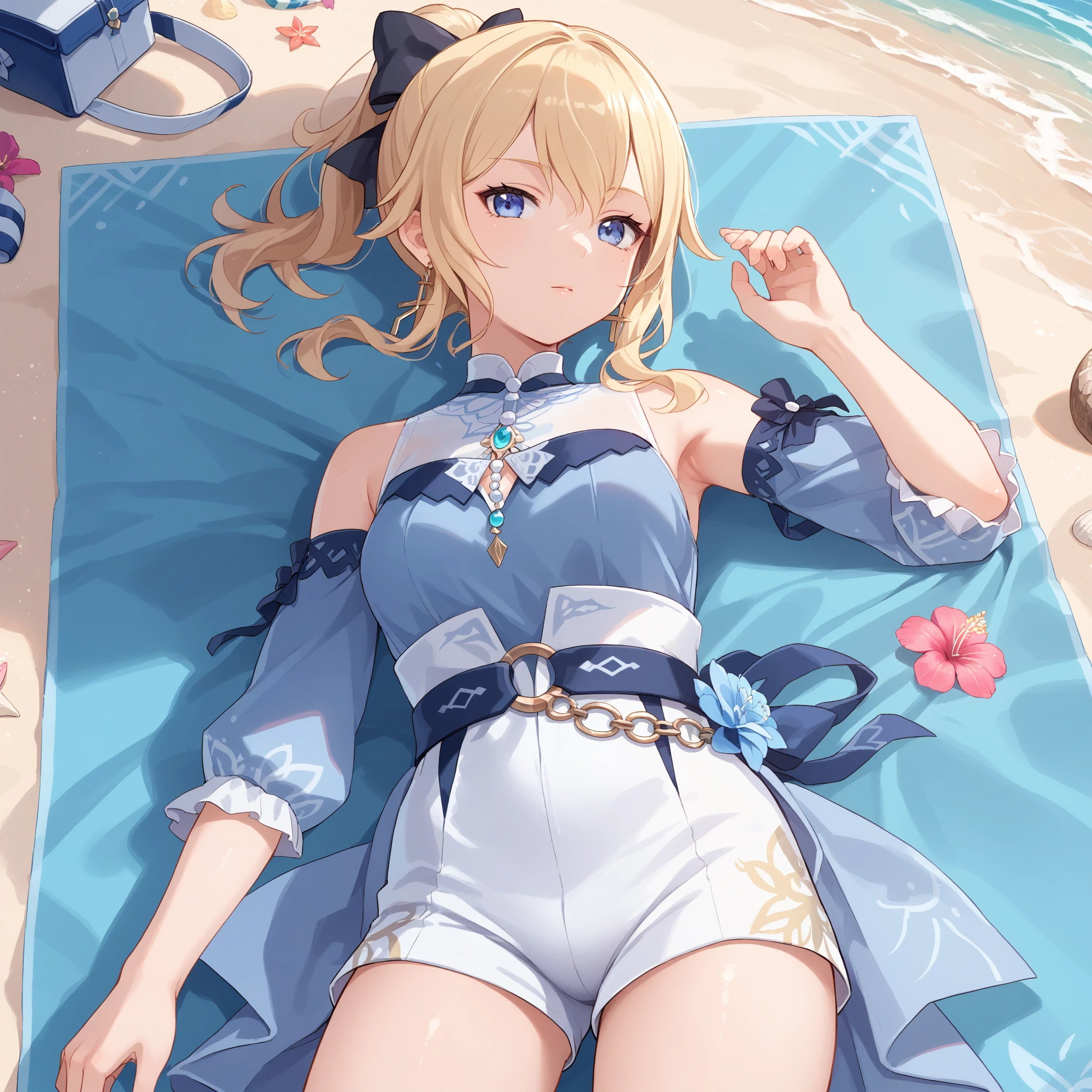 Sea Breeze Costume : jean \(genshin impact\), jean sea breeze, official alternate costume, blue eyes, blonde hair, hair bow, ponytail, sidelocks, earrings, detached sleeves, shorts, flower,