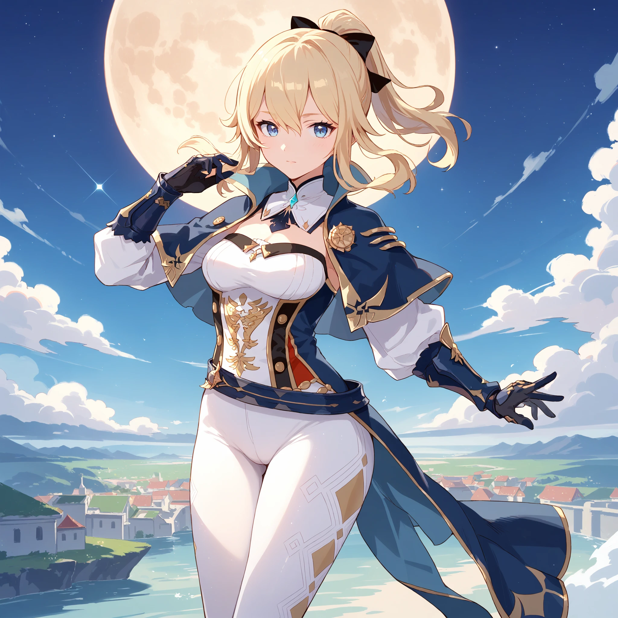 Default : jean \(genshin impact\), jean def, blue eyes, blonde hair,ponytail,black gloves,detached collar,blue capelet, tight pants,