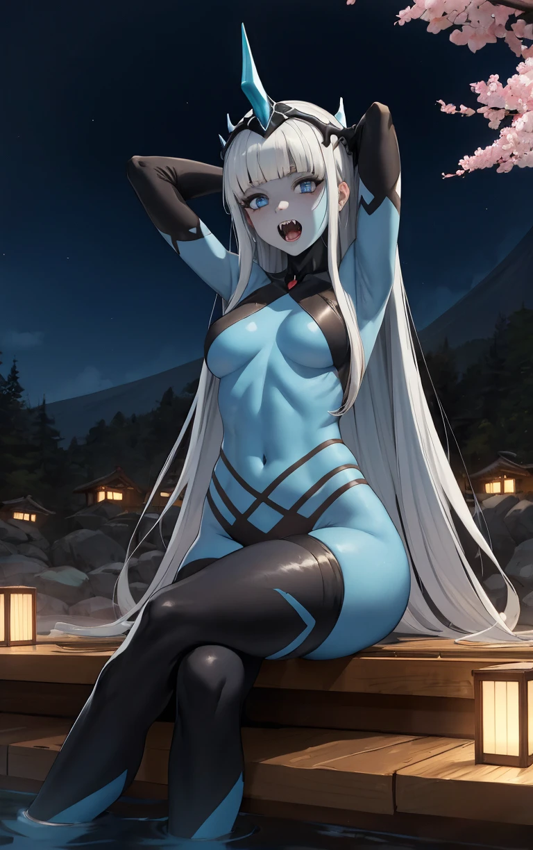 1girl, 001_(darling_in_the_franxx), blue eyes, blue skin, crown, hair ornament, hime cut, long hair, single horn, straight hair, white hair, blunt bangs, colored skin, blue horns, small breasts, tail, collarbone, blue nails, very long hair, bangs, dragon tail, fangs, nail polish, sidelocks,