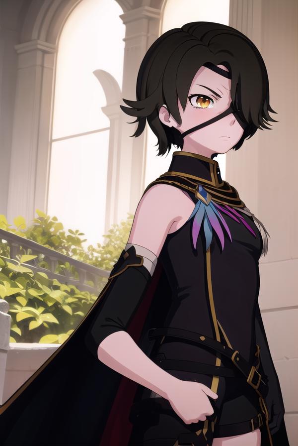 thighhighs, gloves, jewelry, boots, shorts, black gloves, belt, cape, thigh boots, bandages, dress, black dress, black cape, eyepatch,