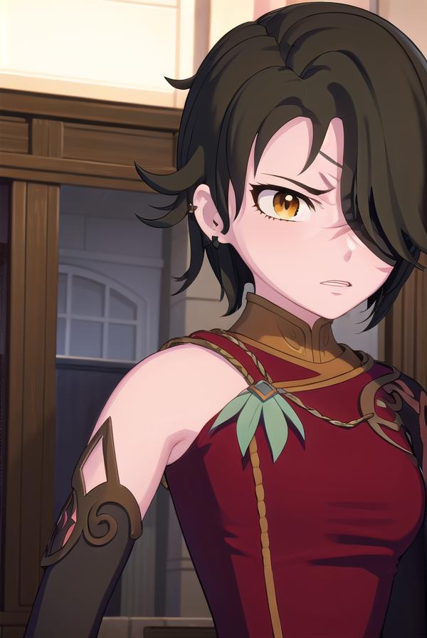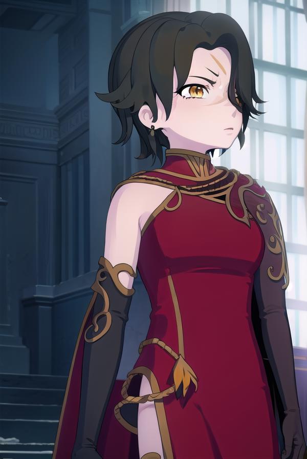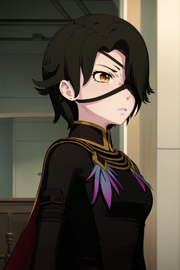cinder fall, short hair, black hair, (yellow eyes:1.5),