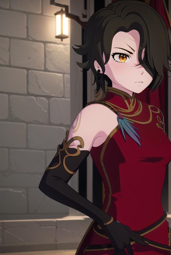 gloves, dress, jewelry, earrings, black gloves, elbow gloves, hair over one eye, tattoo, scar, chinese clothes, red dress, china dress,
