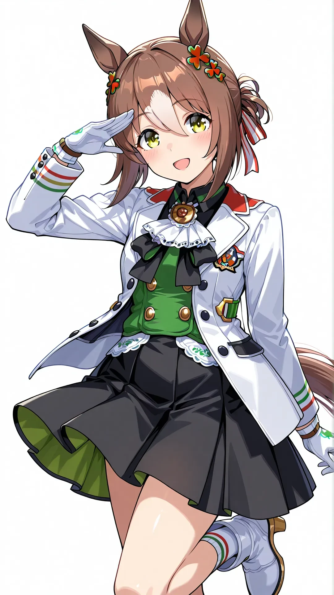 clover hair ornament,hair ribbon,white ascot,black bowtie,long sleeves,white gloves,white jacket,collared shirt,green shirt,buttons,open jacket,open clothes,black skirt,pleated skirt,white socks,white footwear,high heel boots,